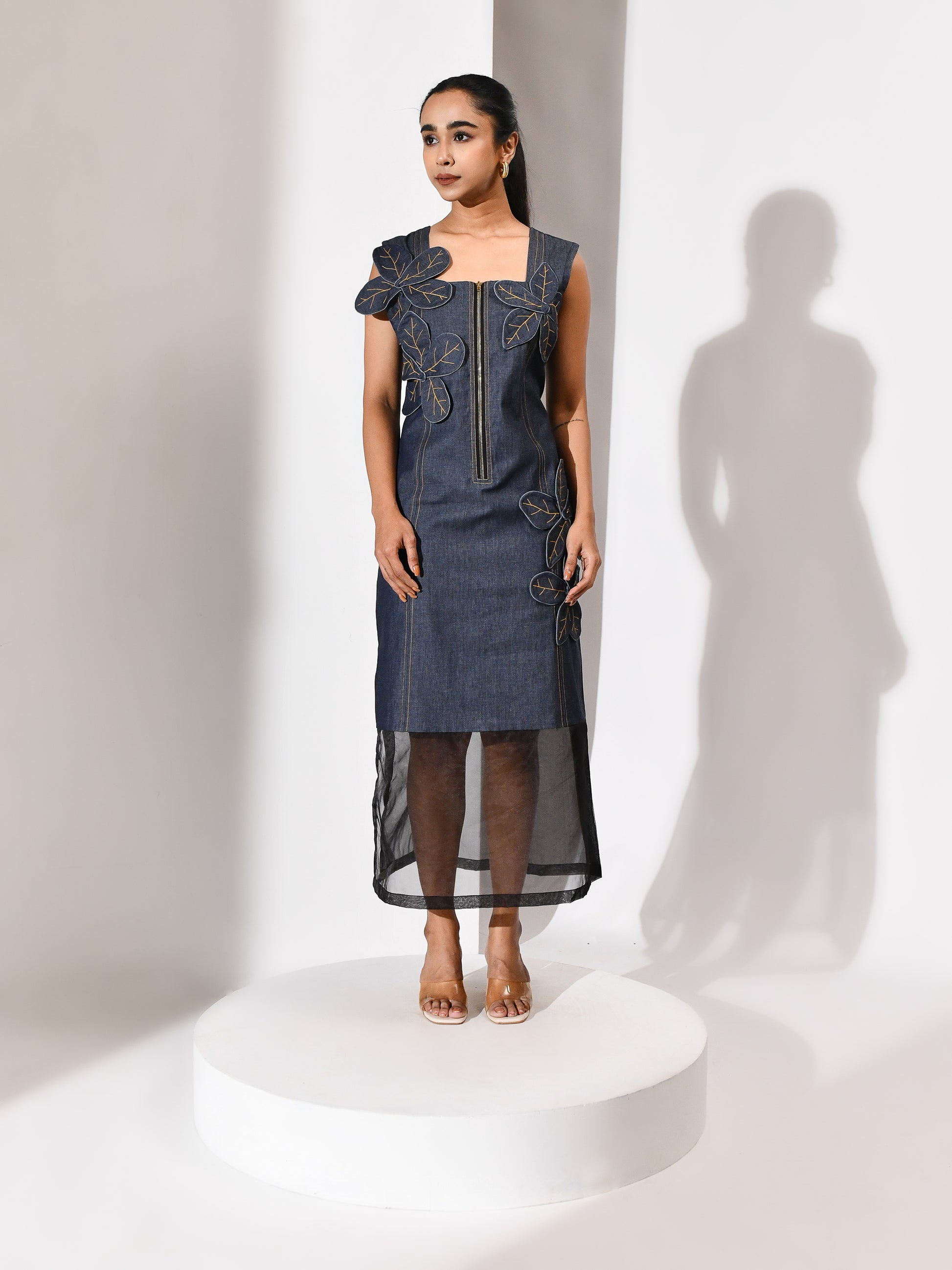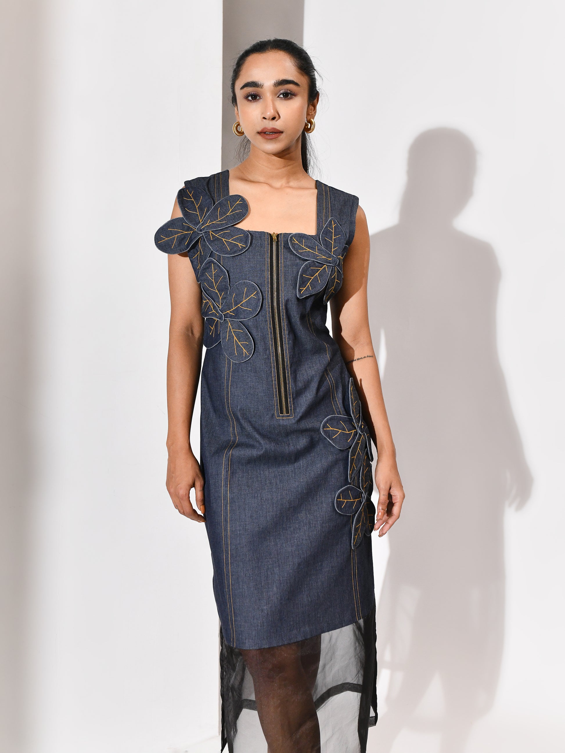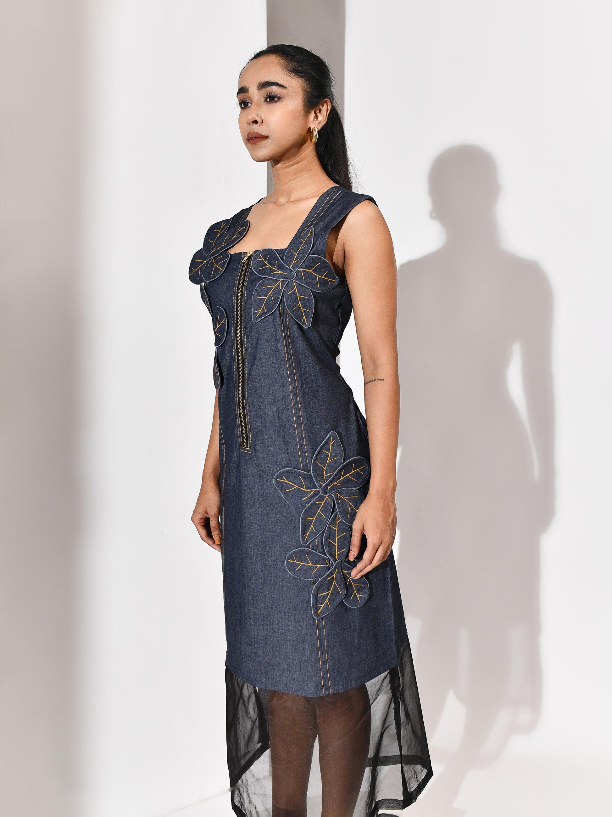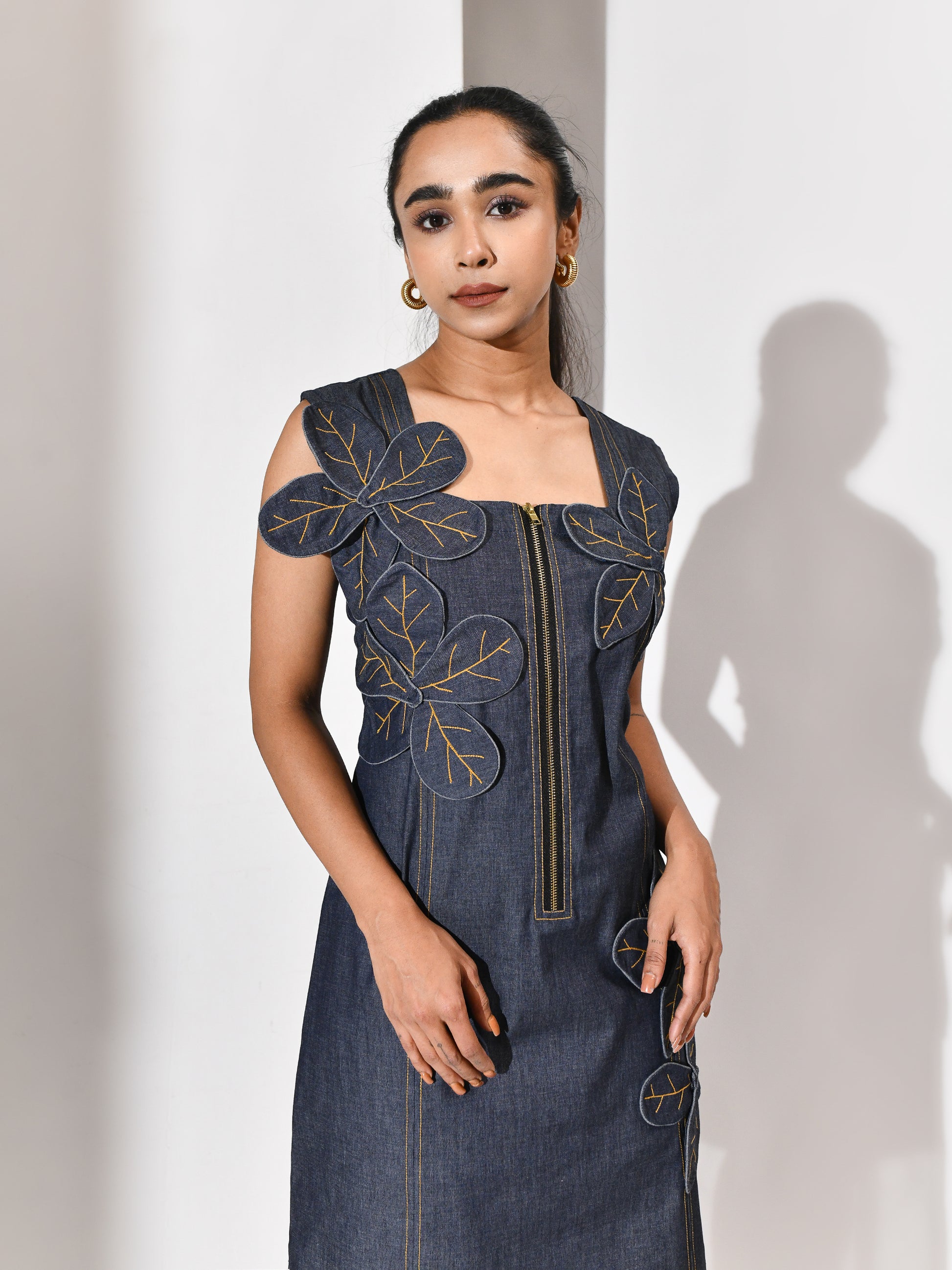 A bloom carved from its own terrain. This denim dress carries a tonal appliqué flower—cut from the same cloth, yet rising with quiet distinction. The silhouette is grounded, the texture deliberate, and the bloom feels both organic and architectural. Floraza is denim reimagined: soft strength, stitched poetry, and a gesture of growth in monochrome. For the woman who blossoms without excess, and speaks in form.