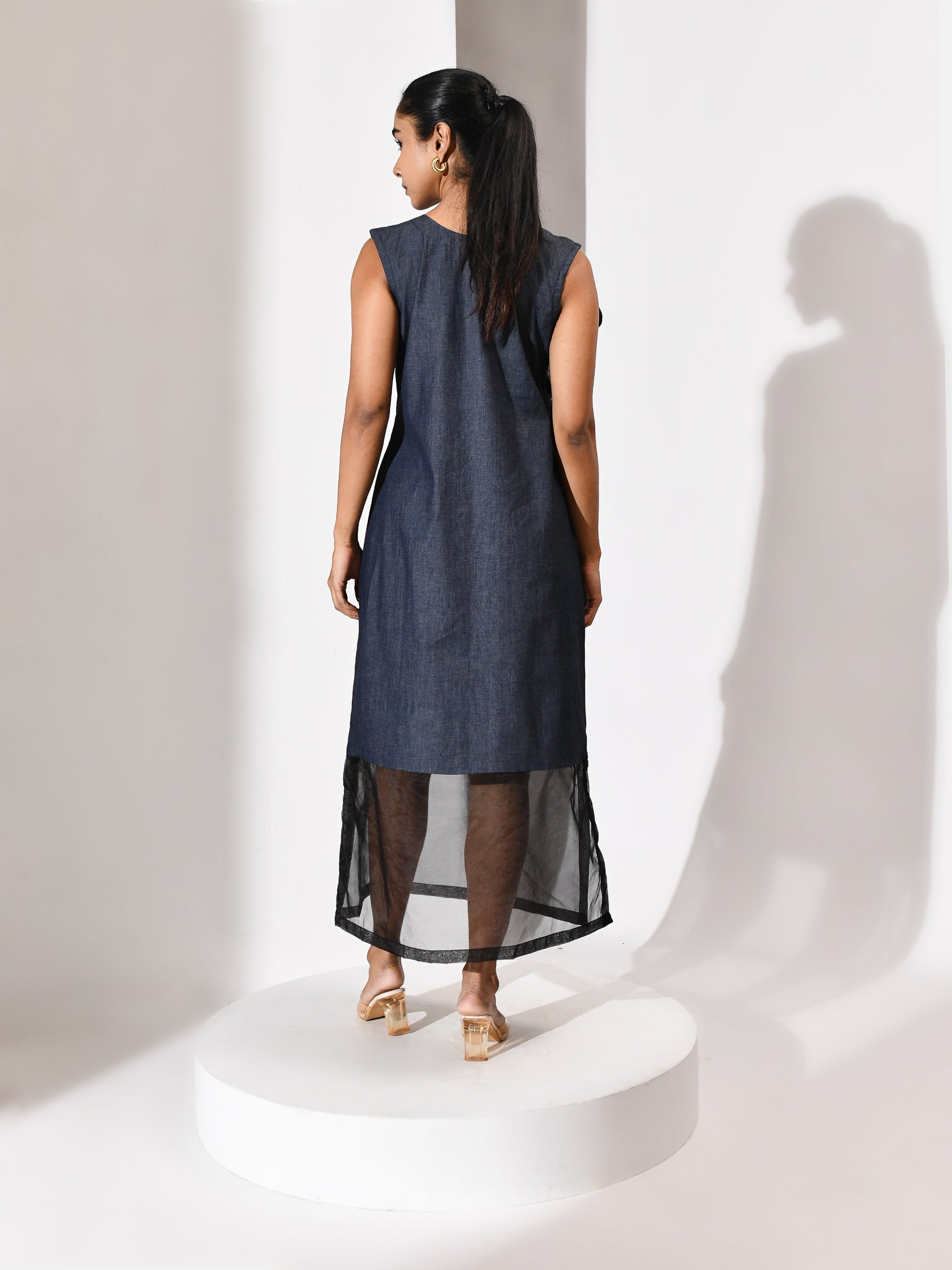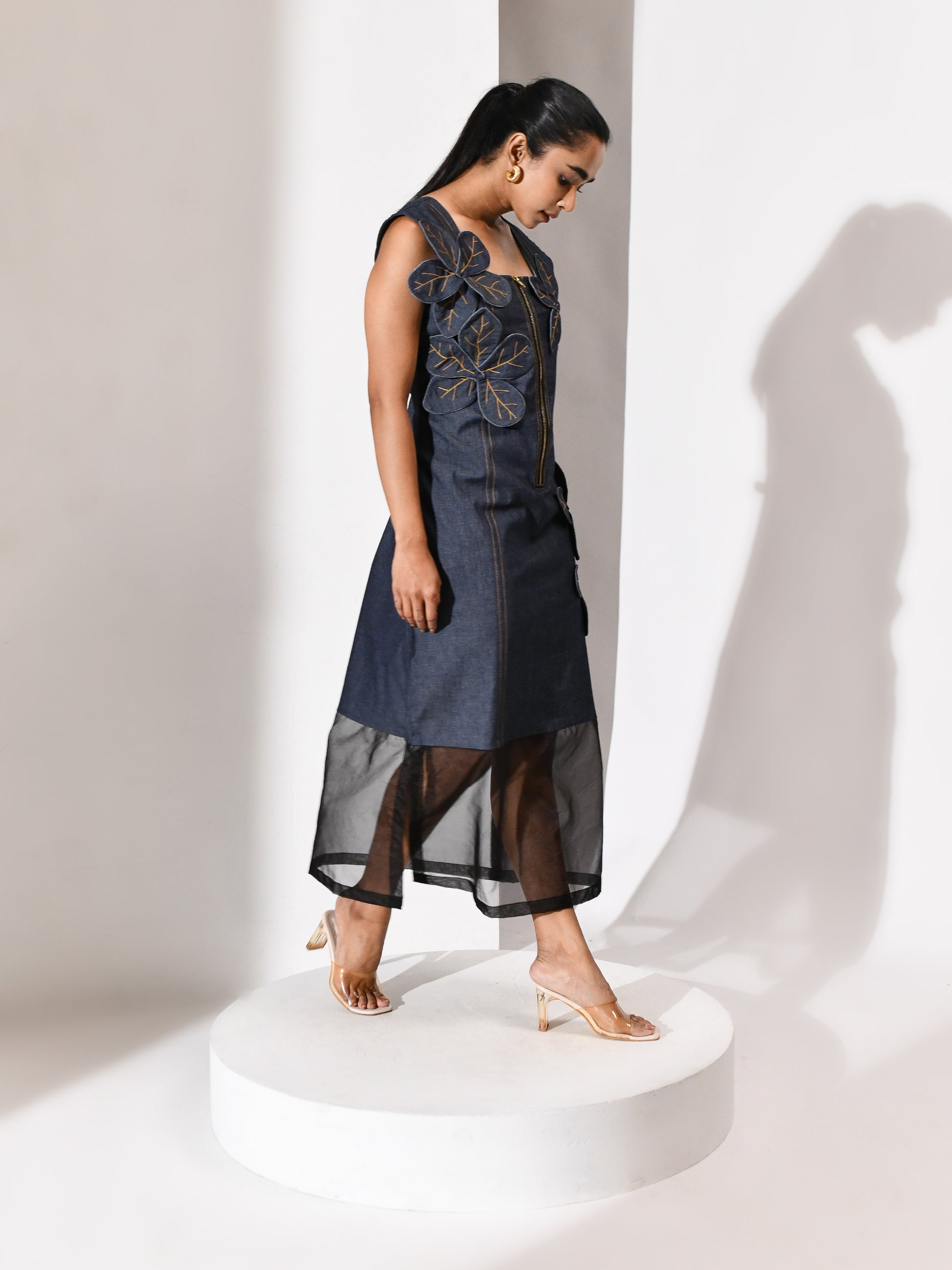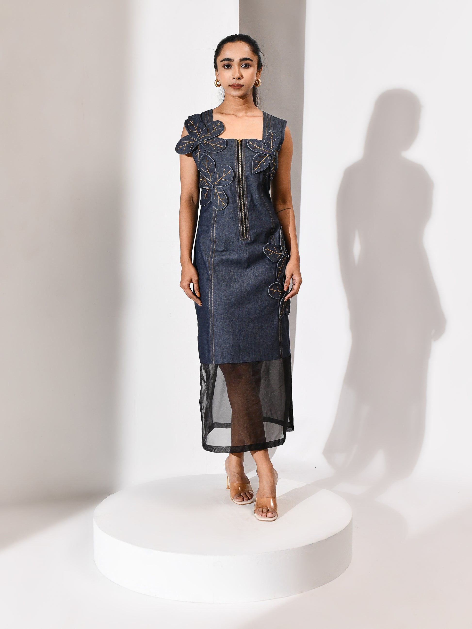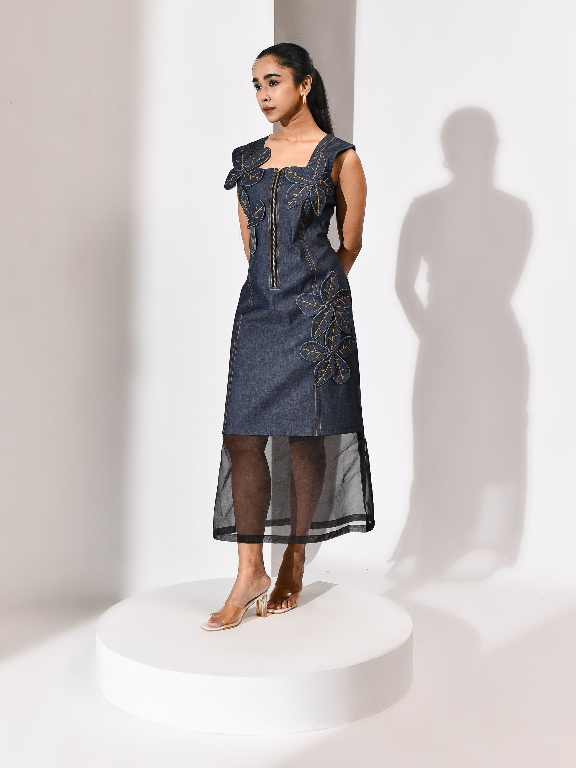 A bloom carved from its own terrain. This denim dress carries a tonal appliqué flower—cut from the same cloth, yet rising with quiet distinction. The silhouette is grounded, the texture deliberate, and the bloom feels both organic and architectural. Floraza is denim reimagined: soft strength, stitched poetry, and a gesture of growth in monochrome. For the woman who blossoms without excess, and speaks in form.