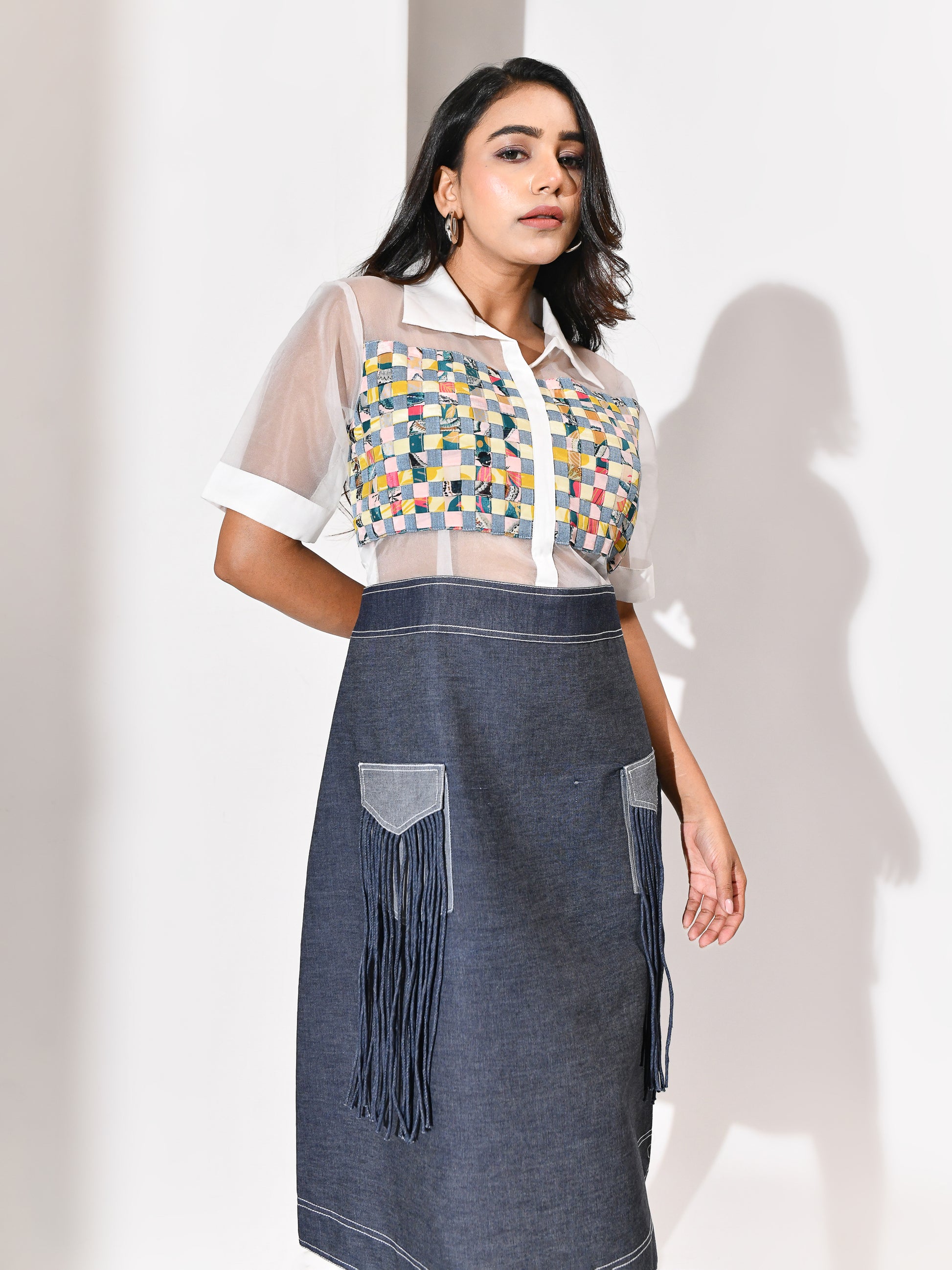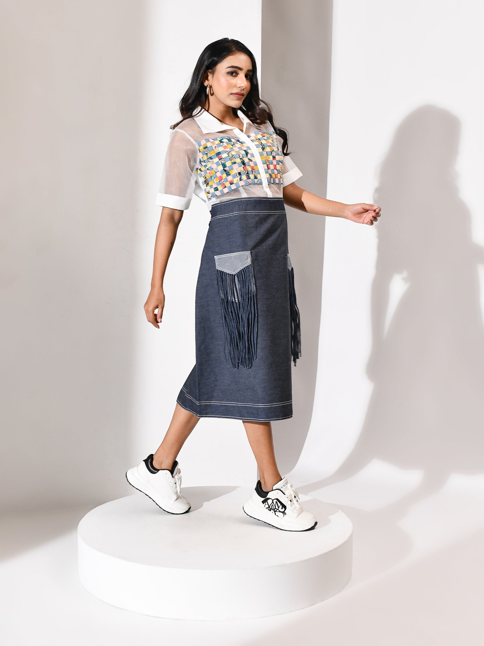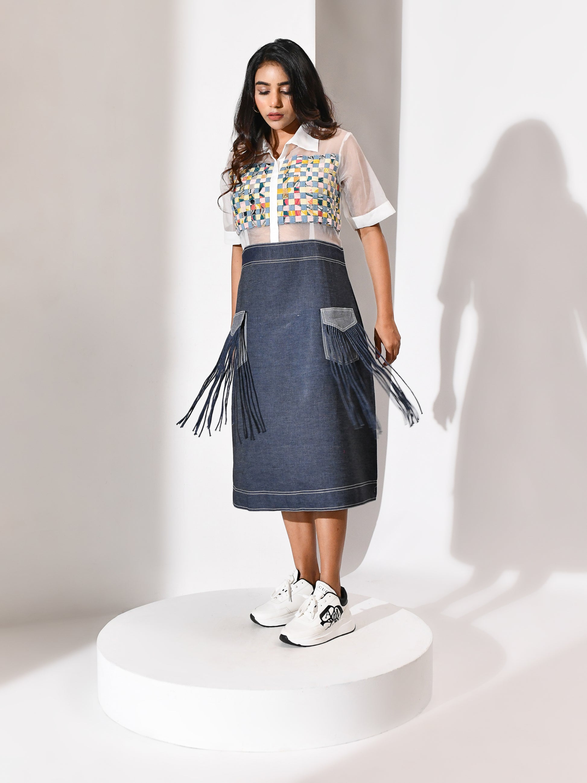 A canvas of quiet expression. This denim dress features printed detailing that feels less like decoration and more like memory—subtle, intentional, and embedded in the weave. The silhouette is grounded yet fluid, allowing the print to emerge like a thought half-spoken. Imprint is not just worn—it’s carried, like a trace of something felt.