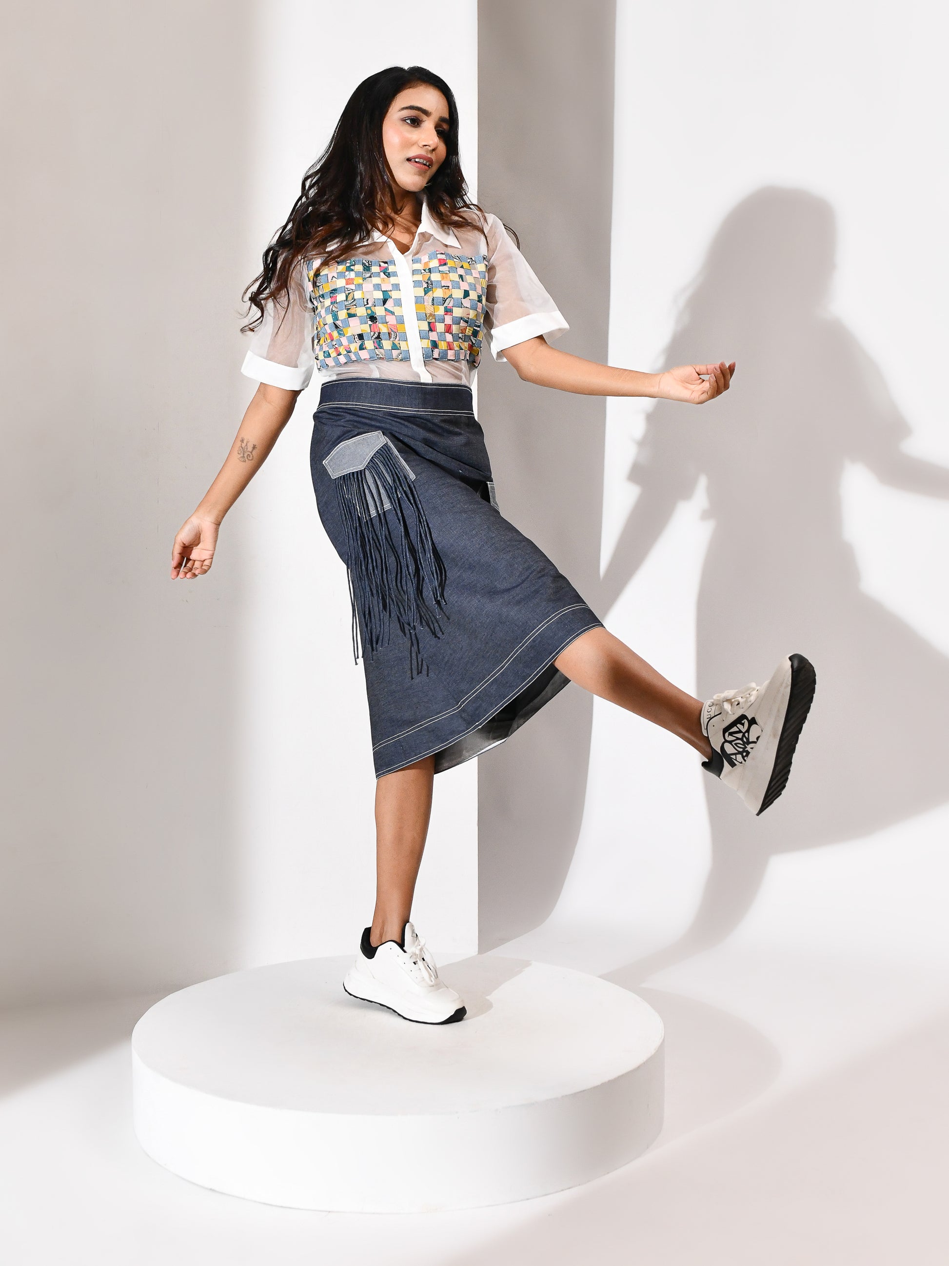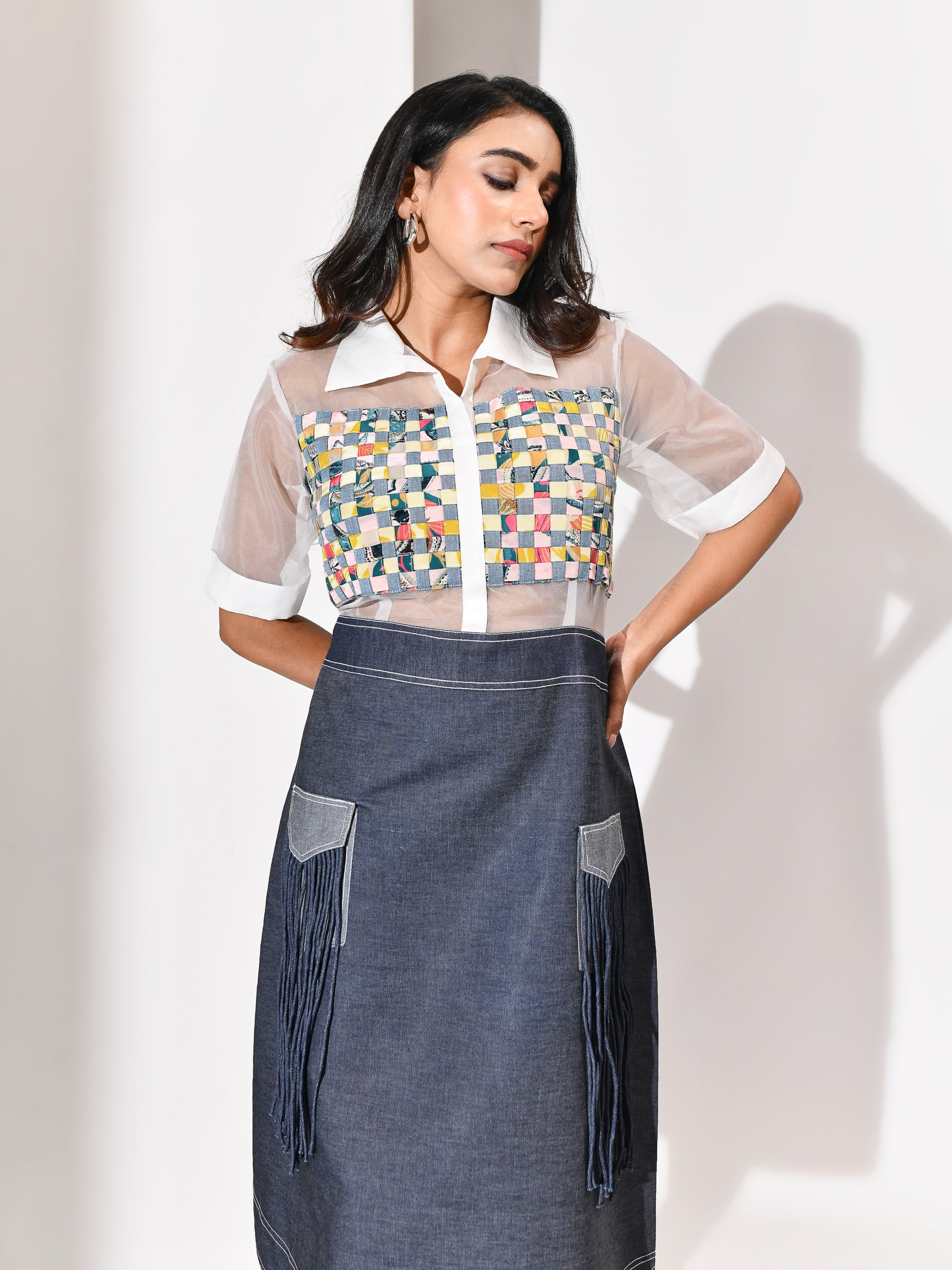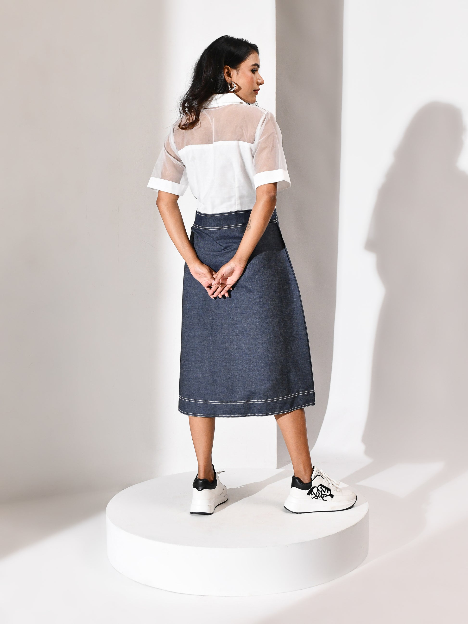 A canvas of quiet expression. This denim dress features printed detailing that feels less like decoration and more like memory—subtle, intentional, and embedded in the weave. The silhouette is grounded yet fluid, allowing the print to emerge like a thought half-spoken. Imprint is not just worn—it’s carried, like a trace of something felt.