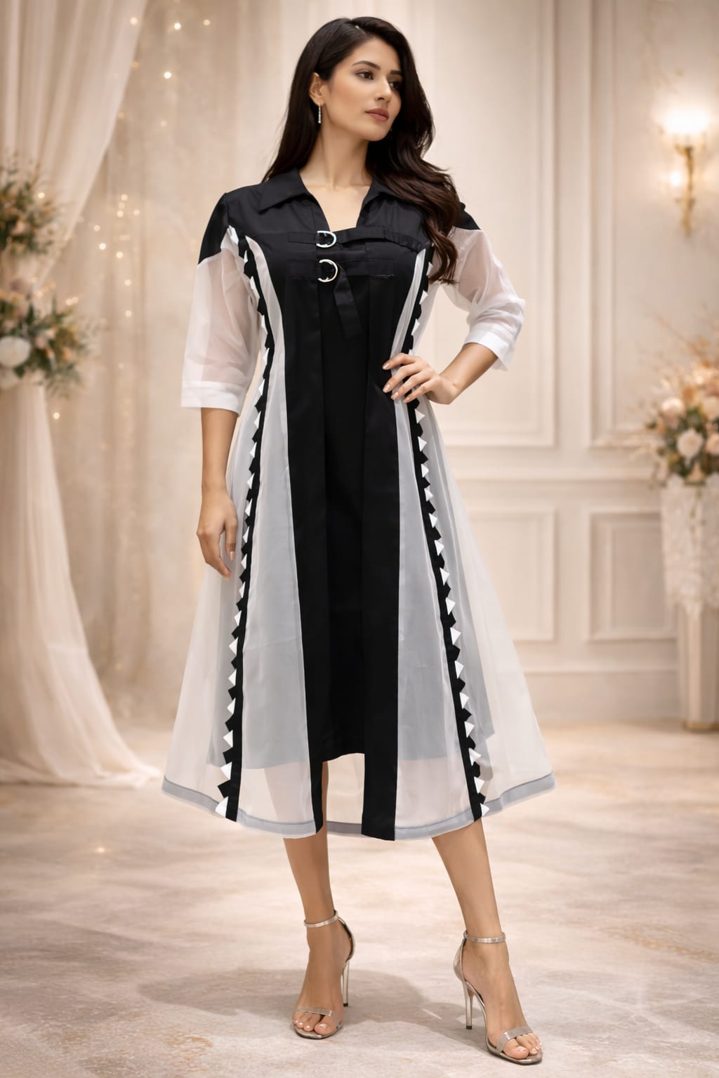 A sleek black dress paired with a organza jacket featuring distinctive barfi-cut detailing. The design blends the mystery of midnight tones with sharp geometric edges, creating a modern yet graceful ensemble perfect for evening wear and festive occasions.
