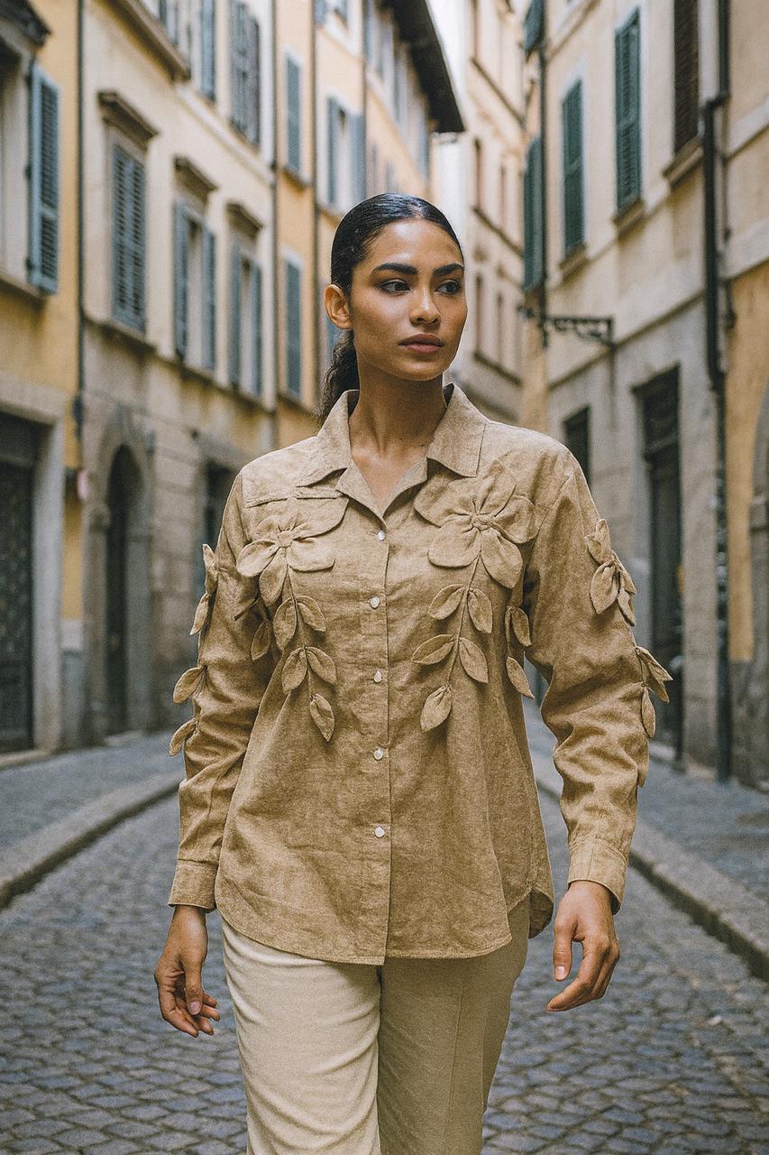 A butter-yellow handloom cotton shirt adorned with embroidered flower and leaf patches, blending natural charm with delicate artistry for a fresh, timeless look.