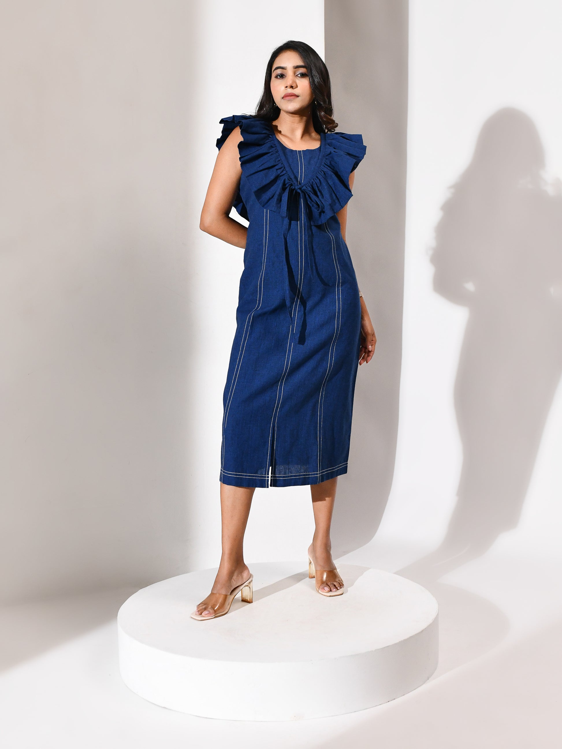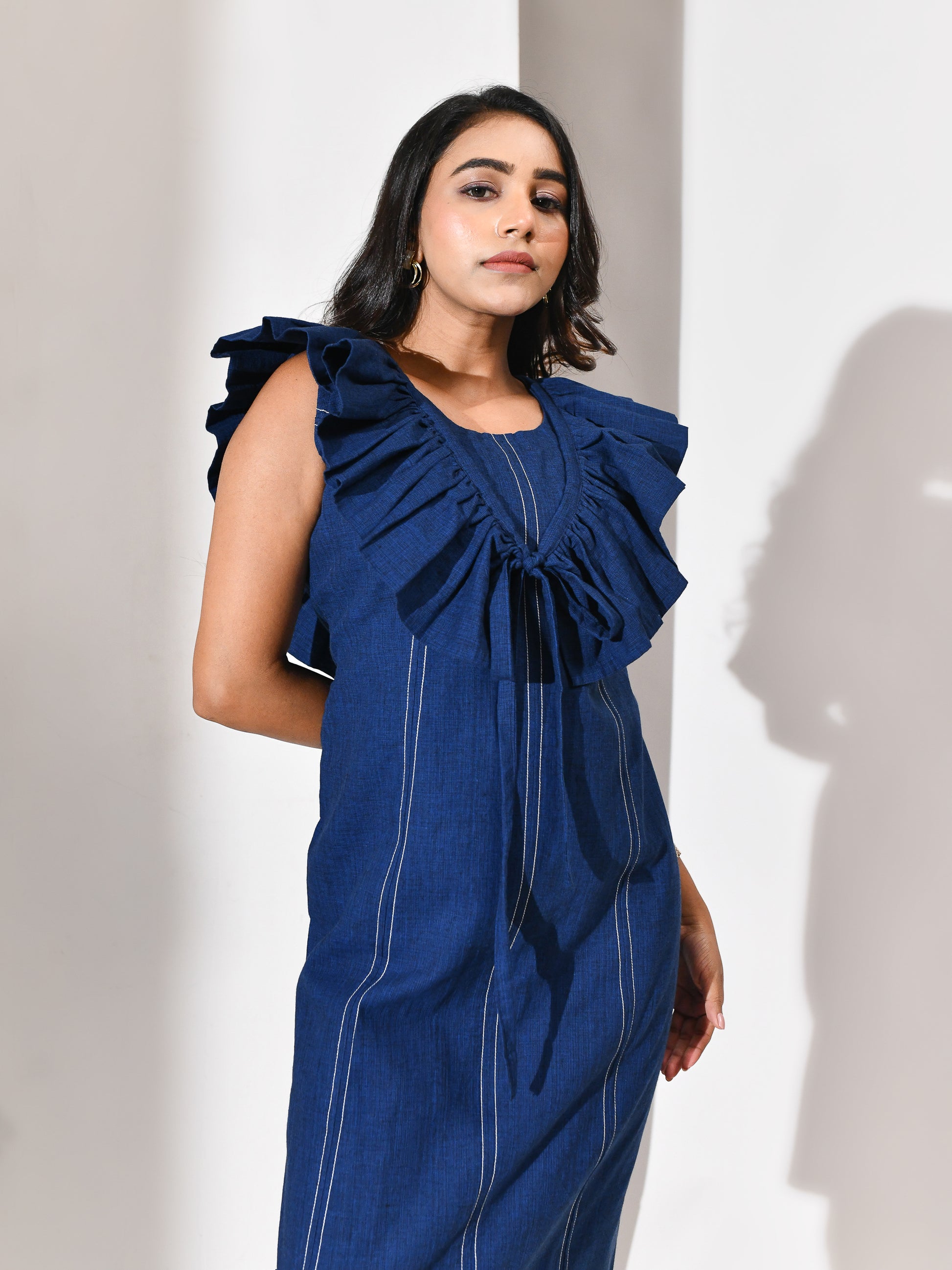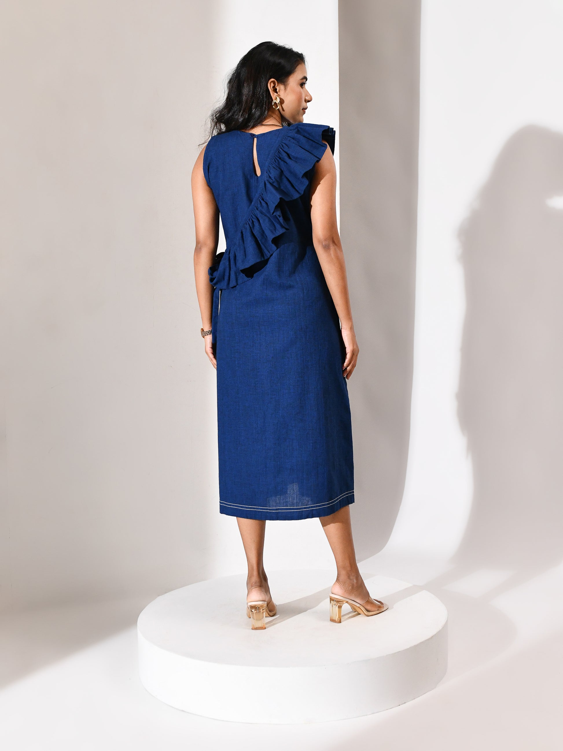 A gesture of quiet drama. This blue dress balances sculptural grace with fluid adaptability, anchored by a gathered sash that can be worn or removed—like a mood, like a memory. The silhouette is pure intention: clean lines softened by movement, elegance made modular. Detaché invites the wearer to choose their rhythm, to shift between restraint and release.