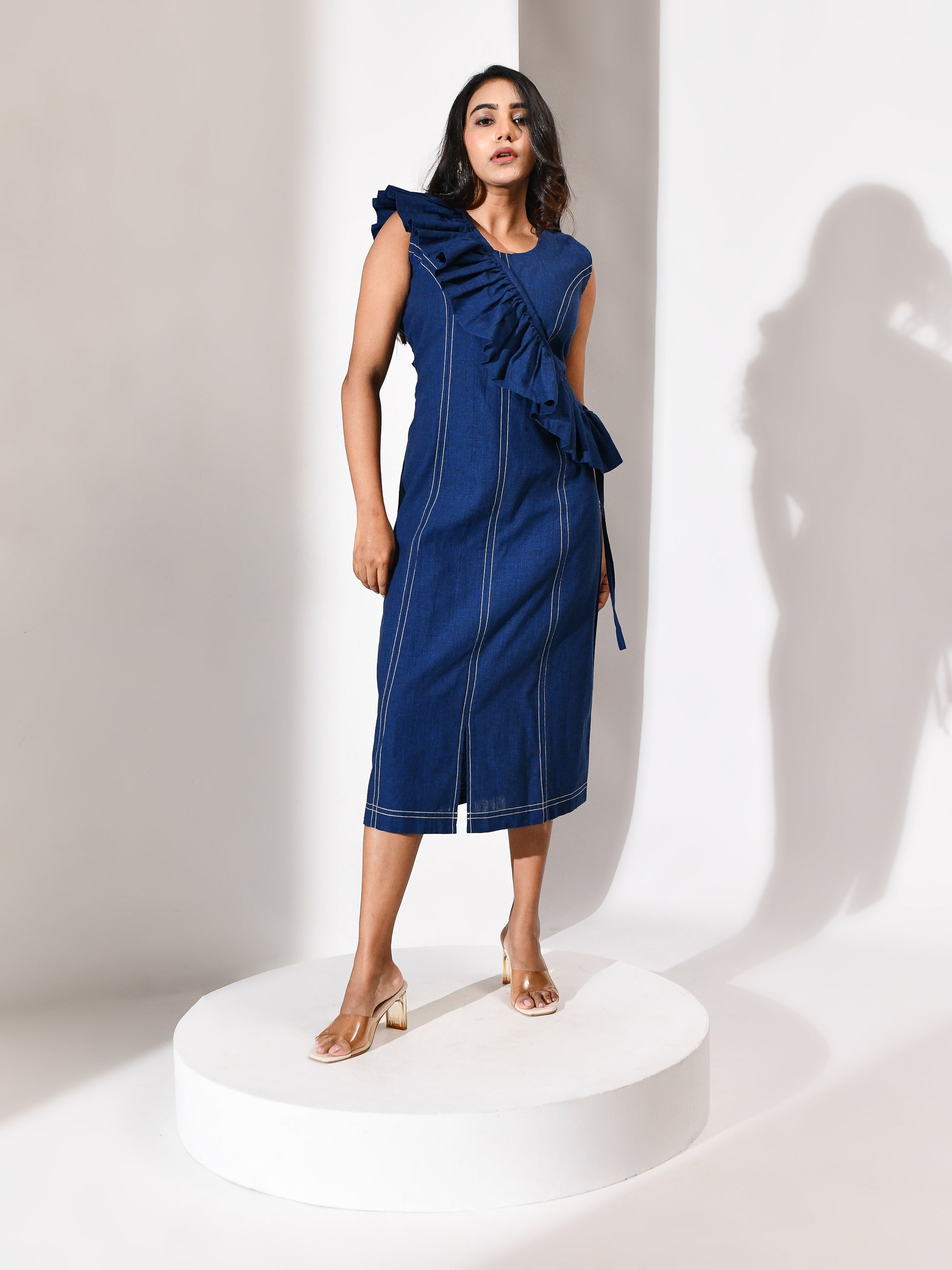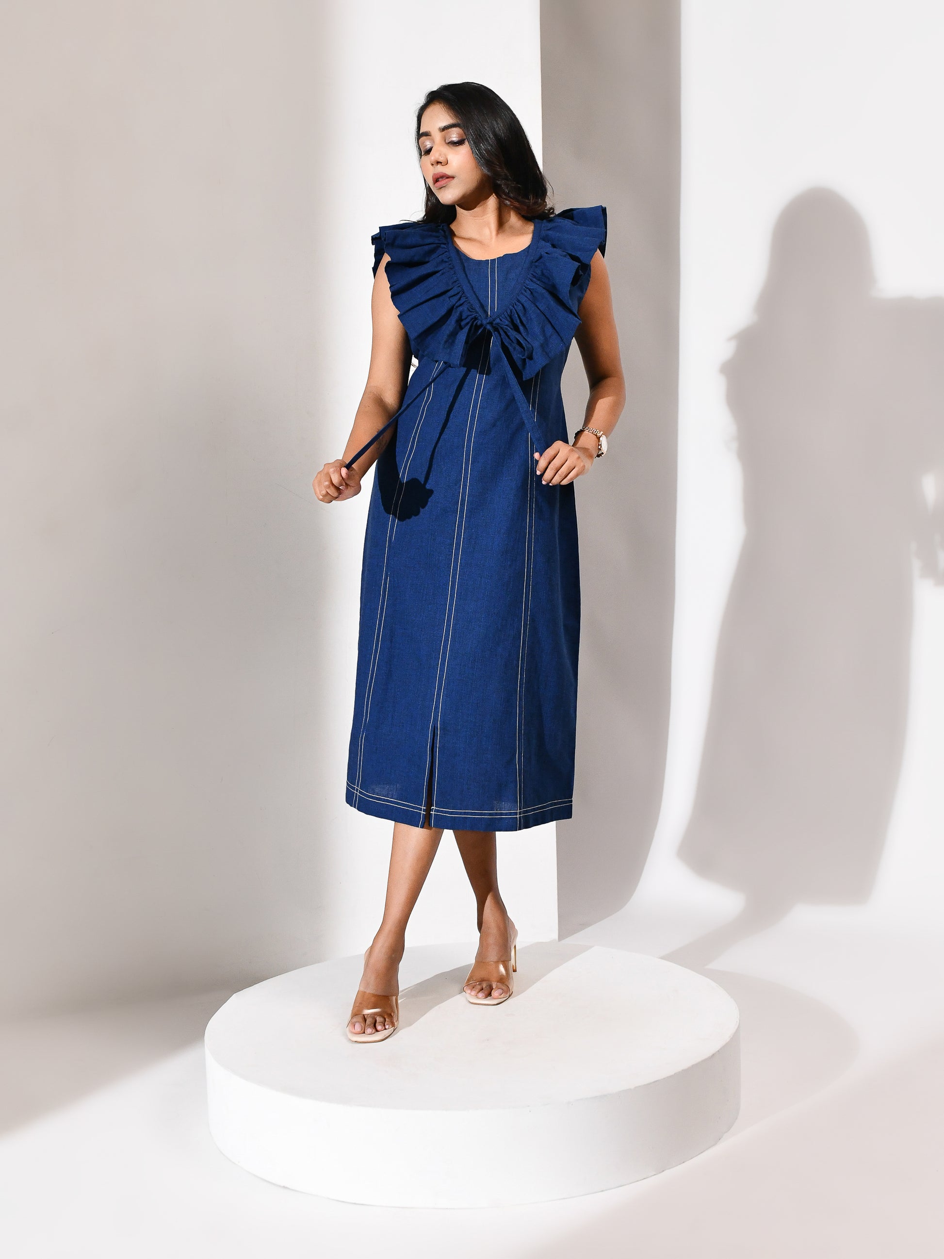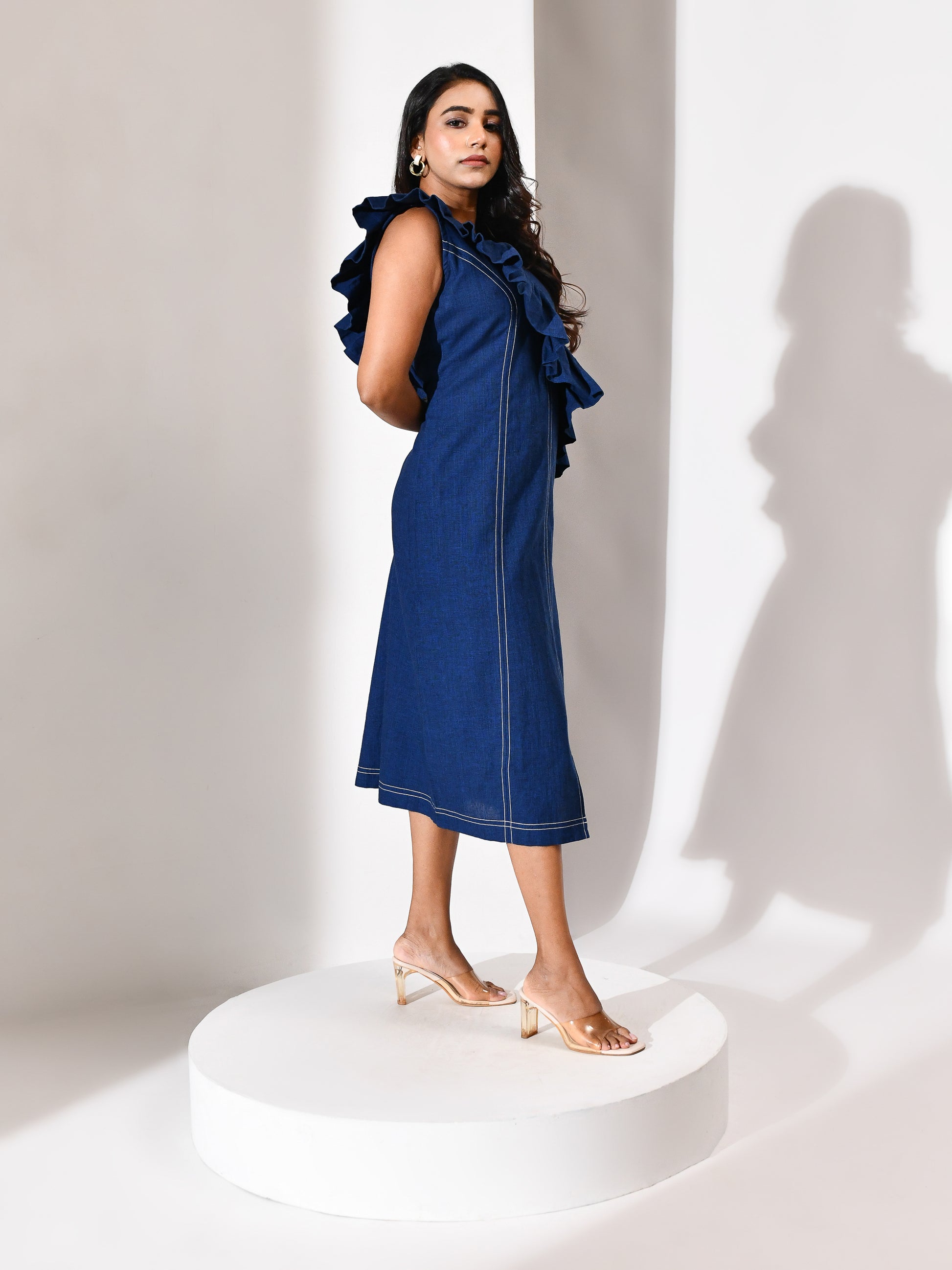 A gesture of quiet drama. This blue dress balances sculptural grace with fluid adaptability, anchored by a gathered sash that can be worn or removed—like a mood, like a memory. The silhouette is pure intention: clean lines softened by movement, elegance made modular. Detaché invites the wearer to choose their rhythm, to shift between restraint and release.