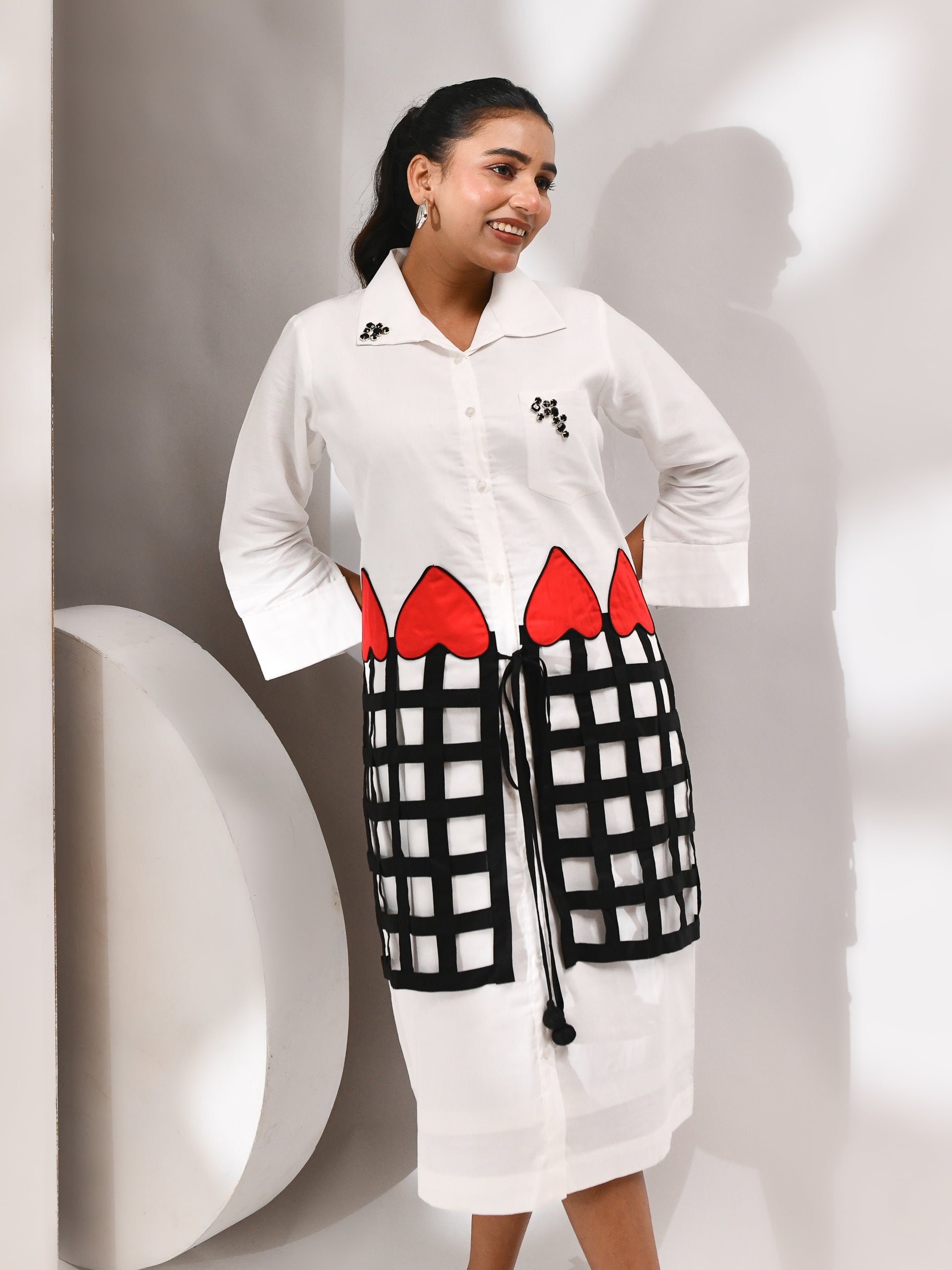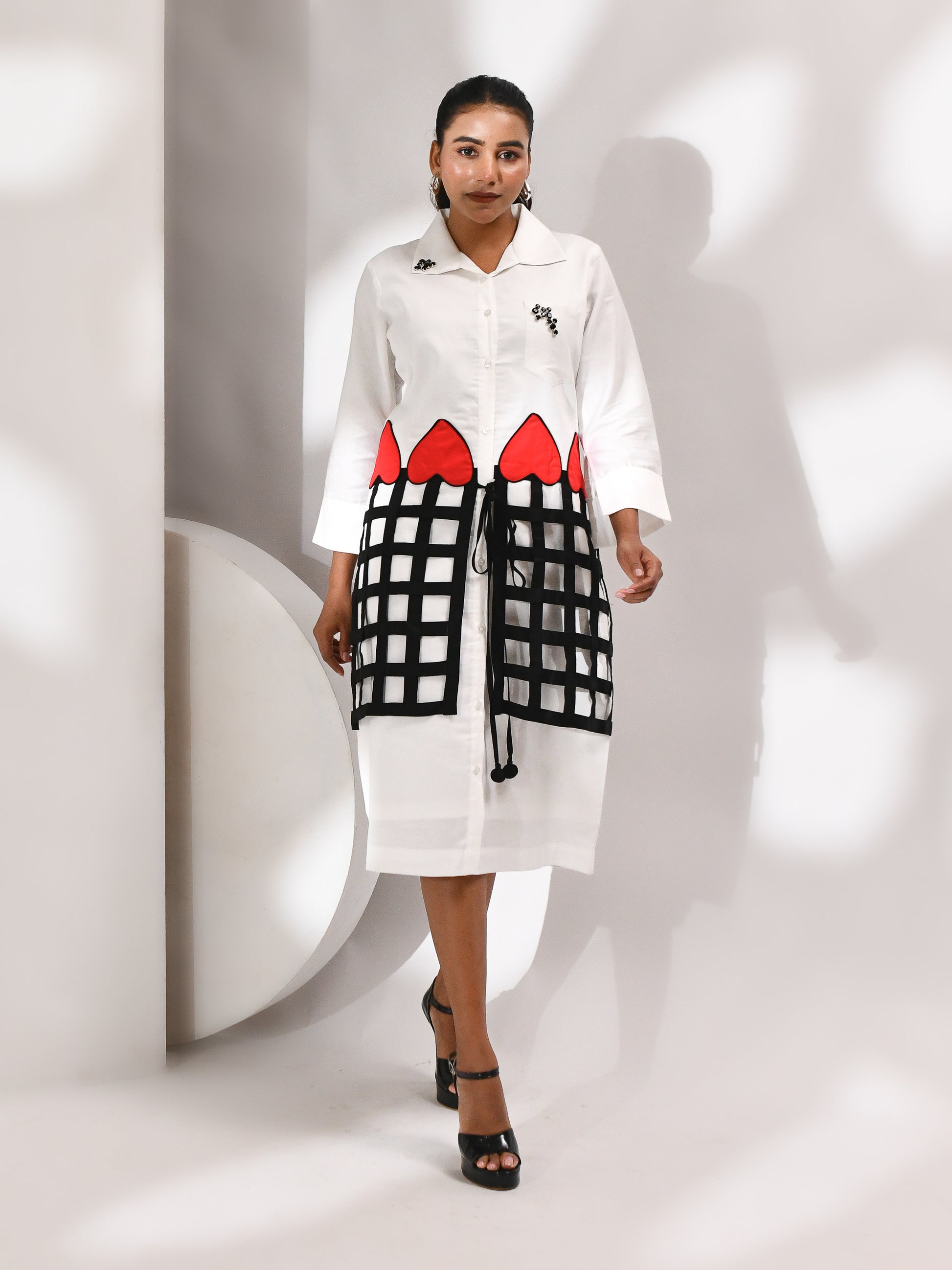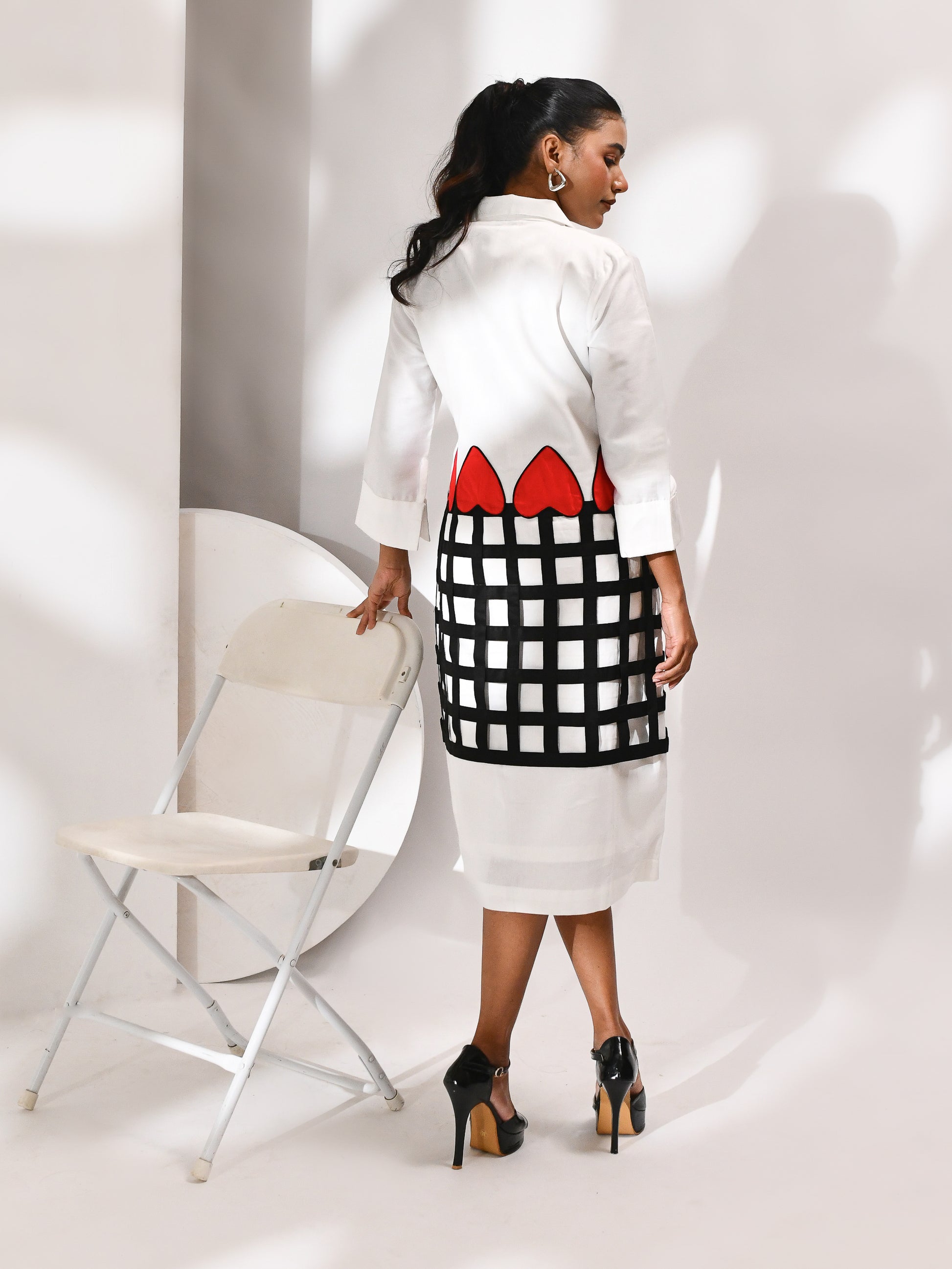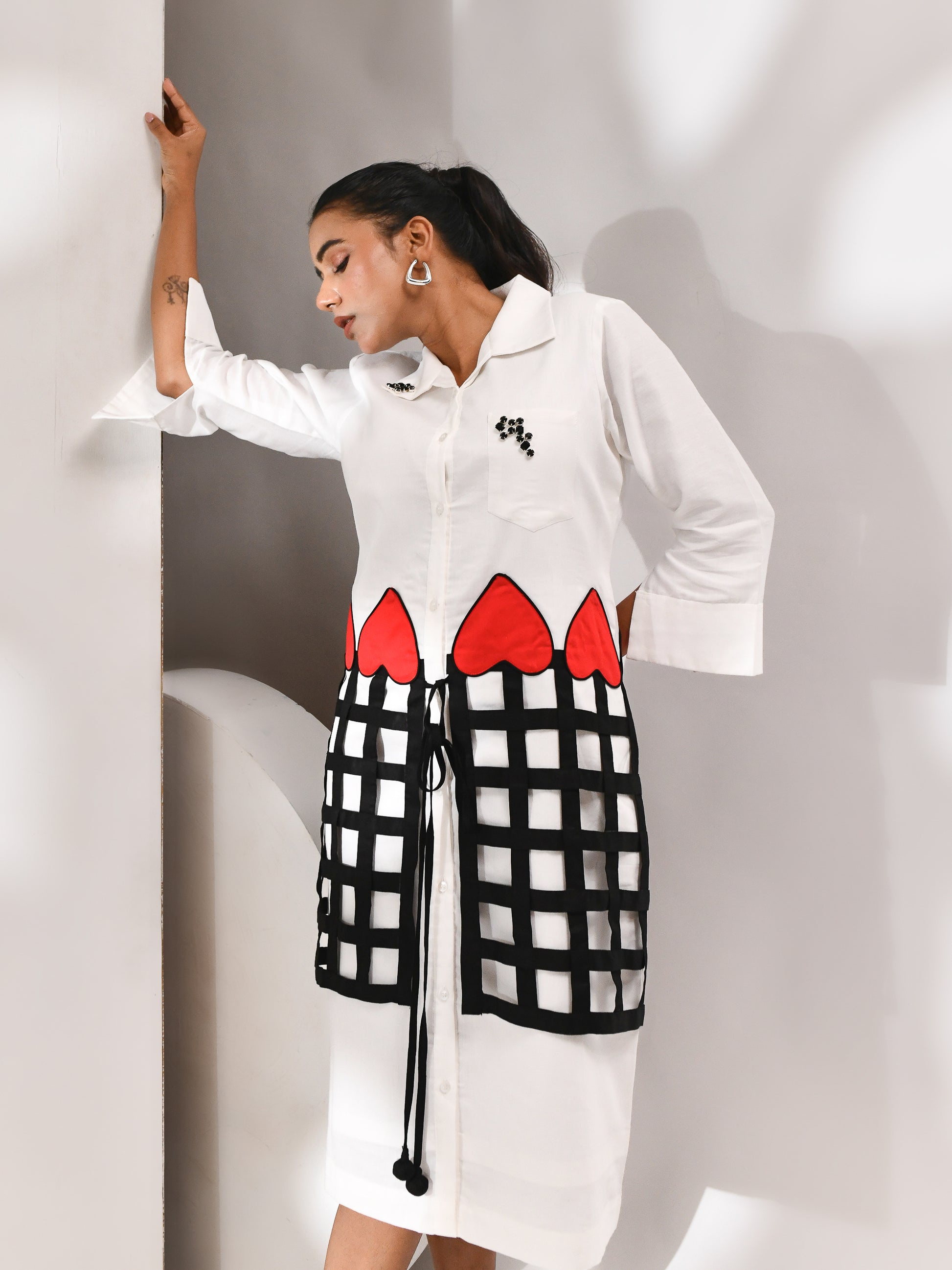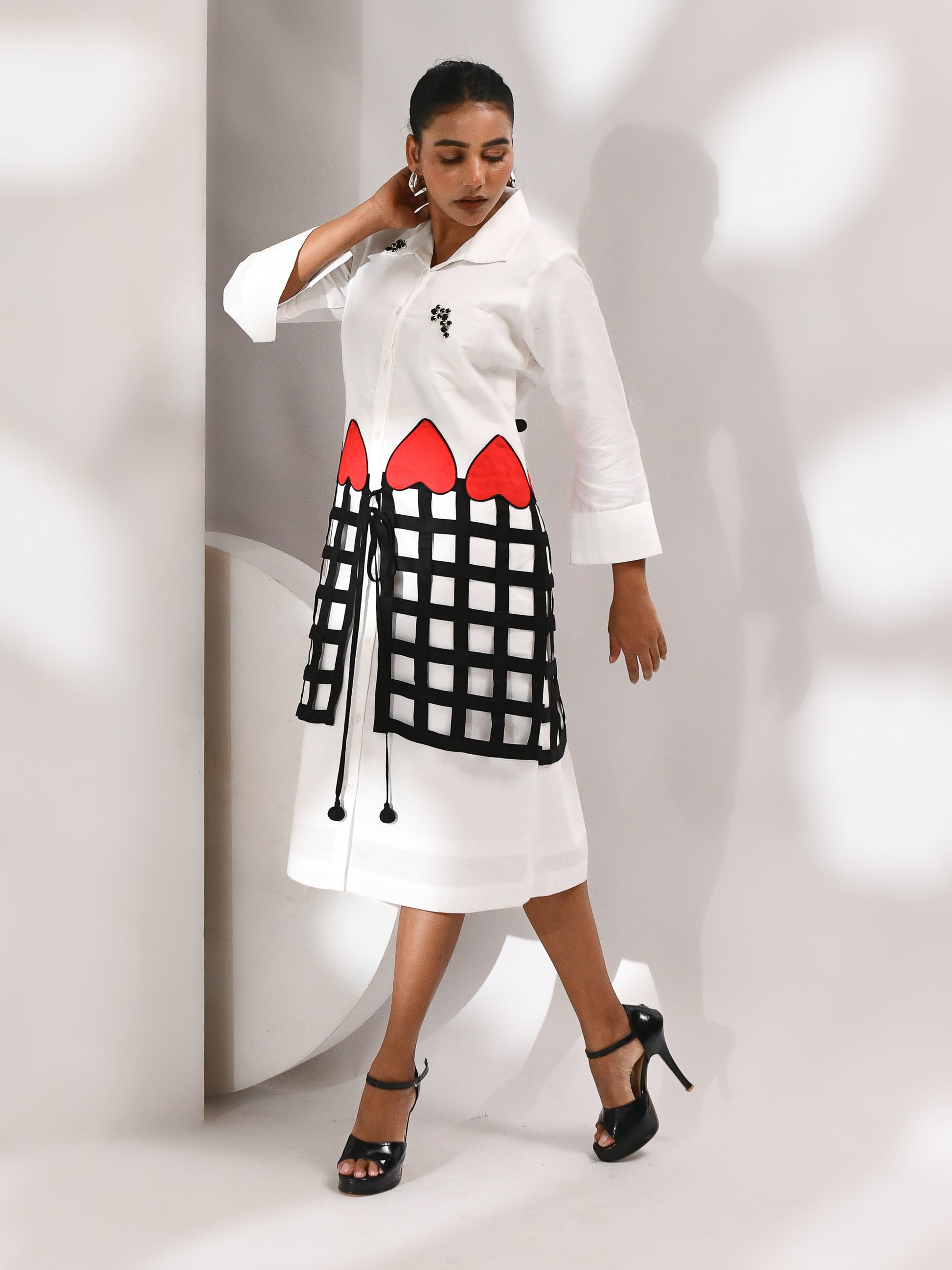 A symbol inverted, a story reimagined. This white dress carries a crimson heart turned on its head—bold, deliberate, and quietly subversive. Black dori detailing traces the silhouette like a heartbeat in thread, grounding emotion in structure. Heartline is not about romance—it’s about reclamation. A garment that speaks in symbols, stitched for the woman who wears her truth with grace and edge.