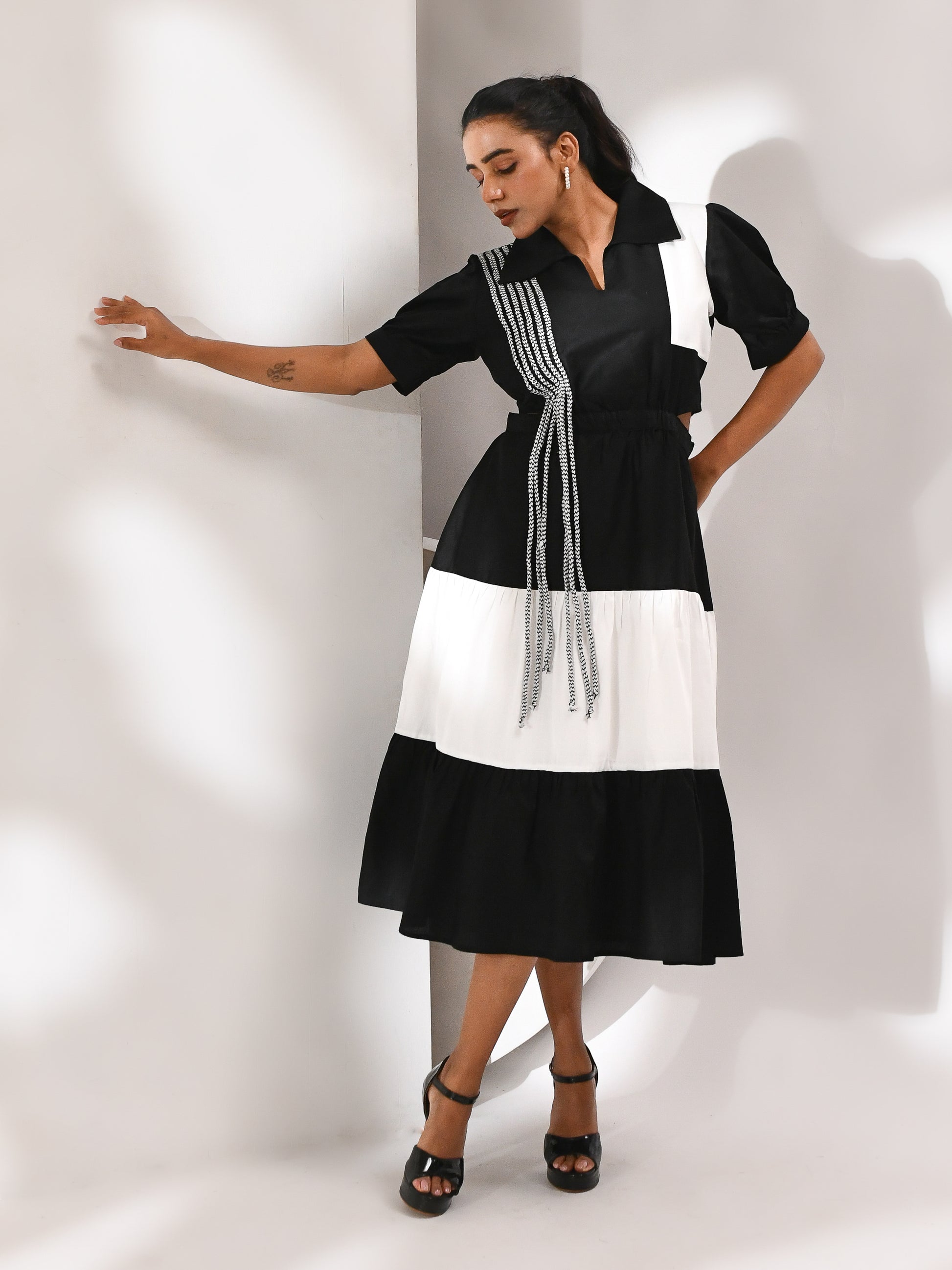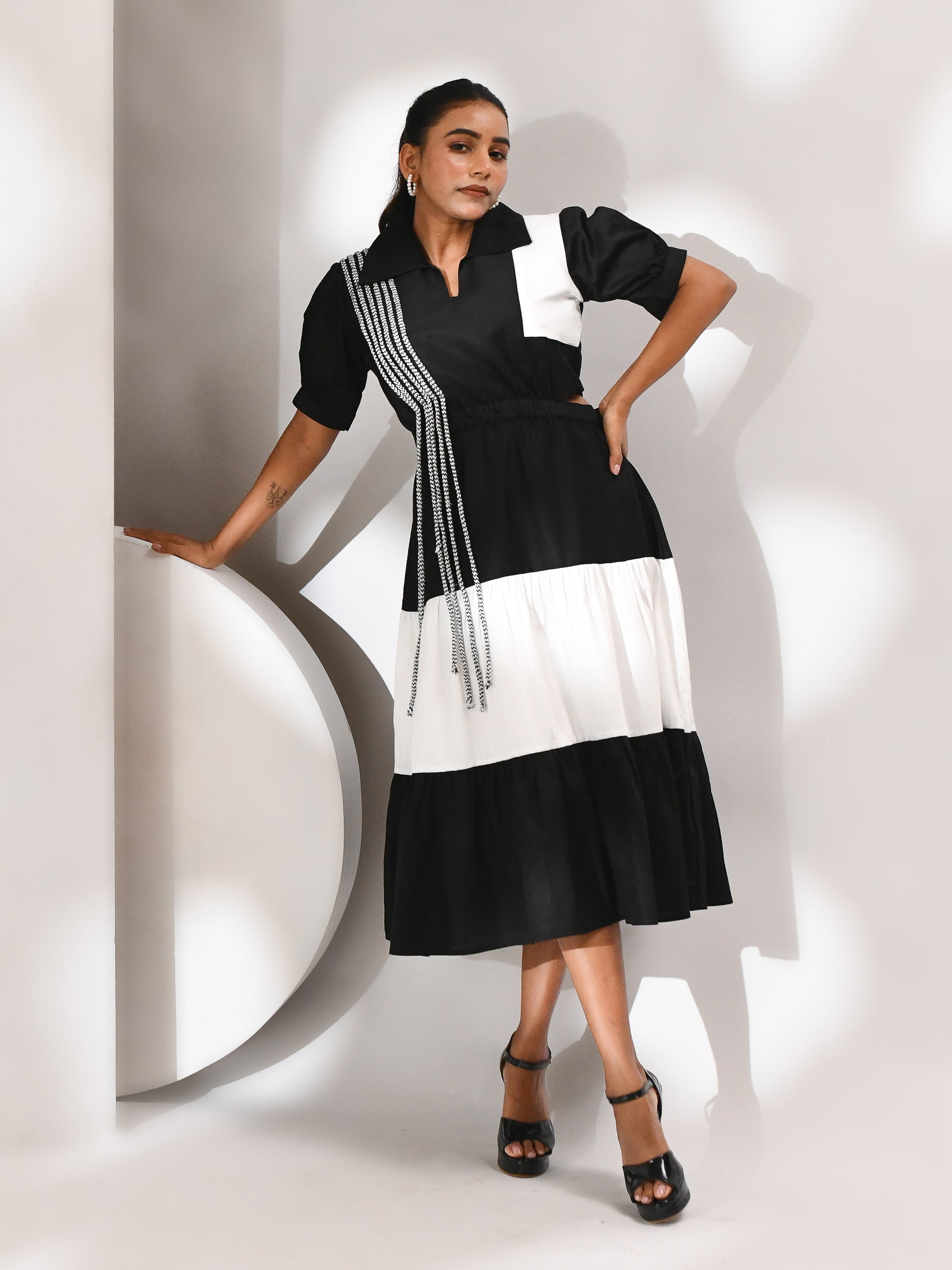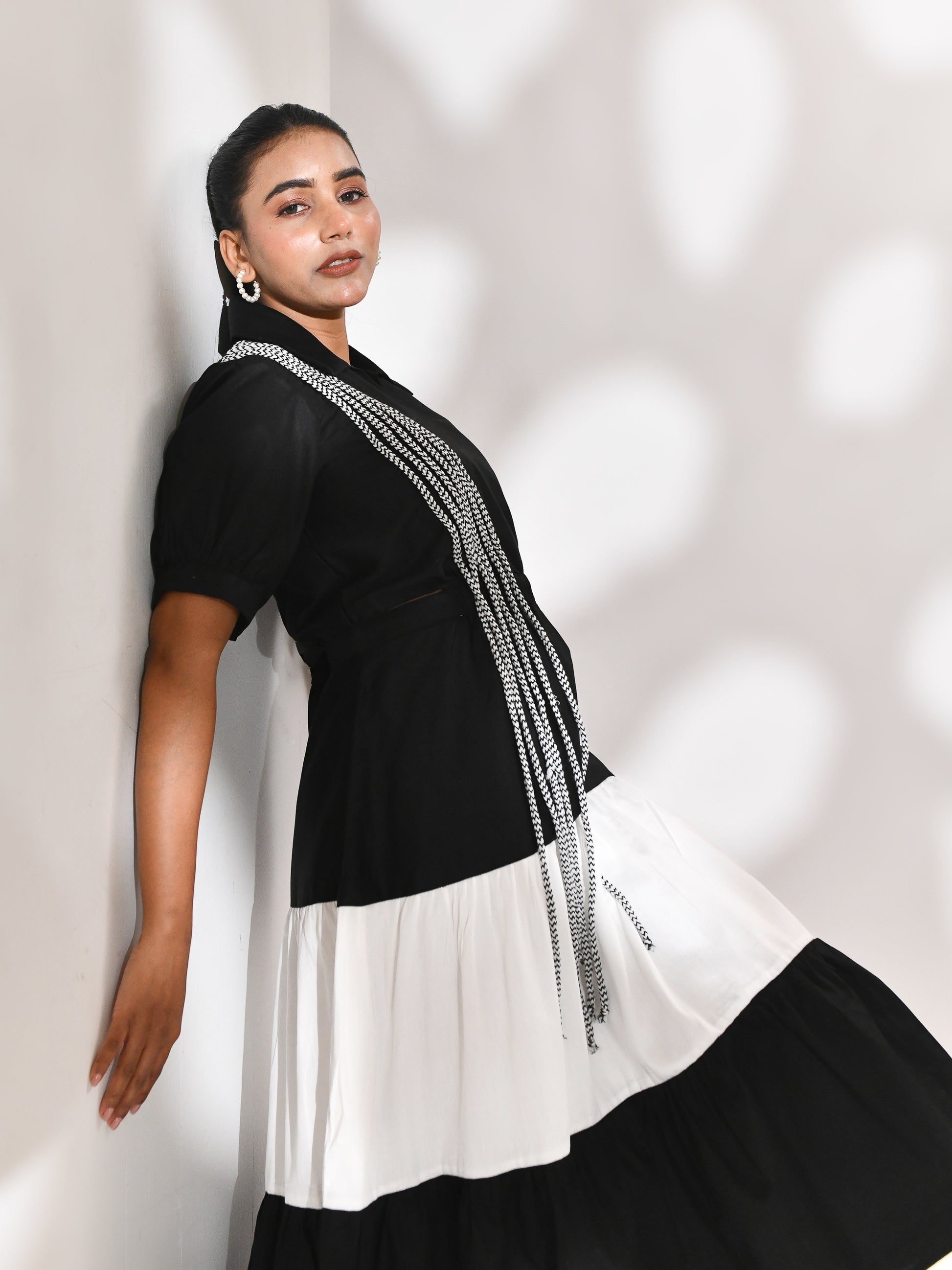 A monochrome masterpiece that plays with rhythm and rebellion, the Ink Cascade dress is tiered to perfection—each layer flowing with sculptural grace. Side cutouts add a bold contour, while the flared hemline brings kinetic energy to every step. Abstract dori detailing traces across the silhouette like a sketch in motion, adding texture and intrigue to its graphic palette.
