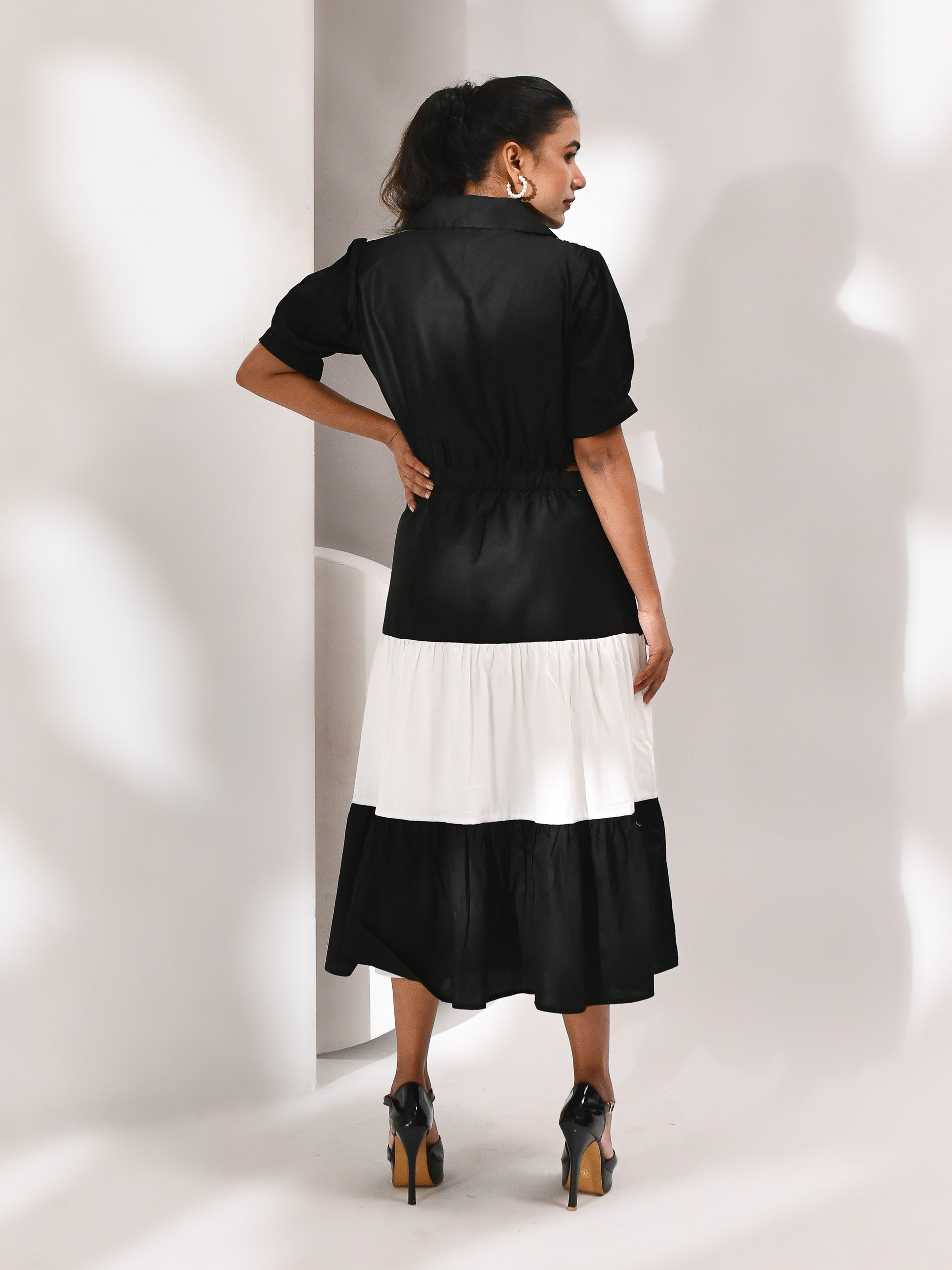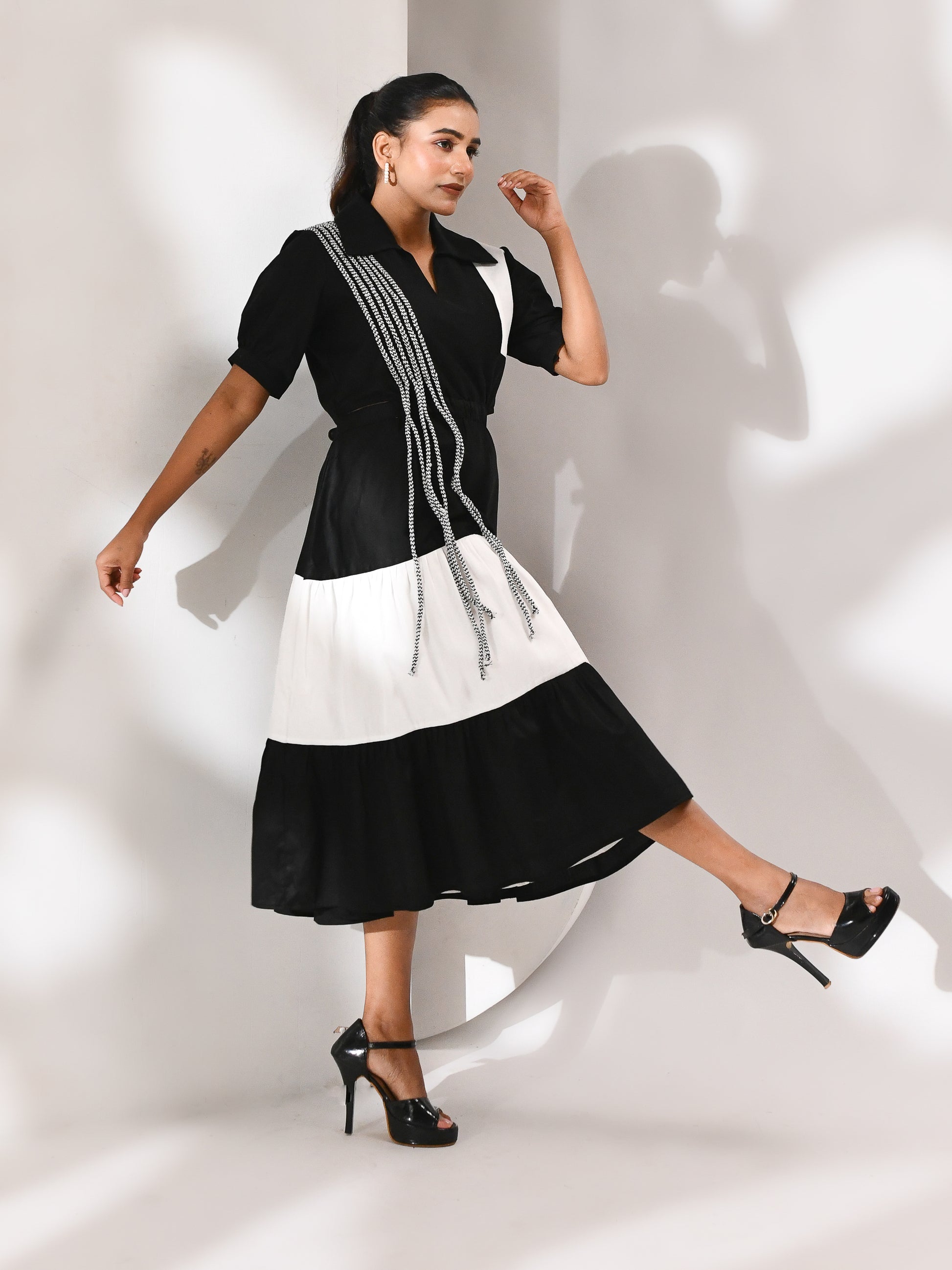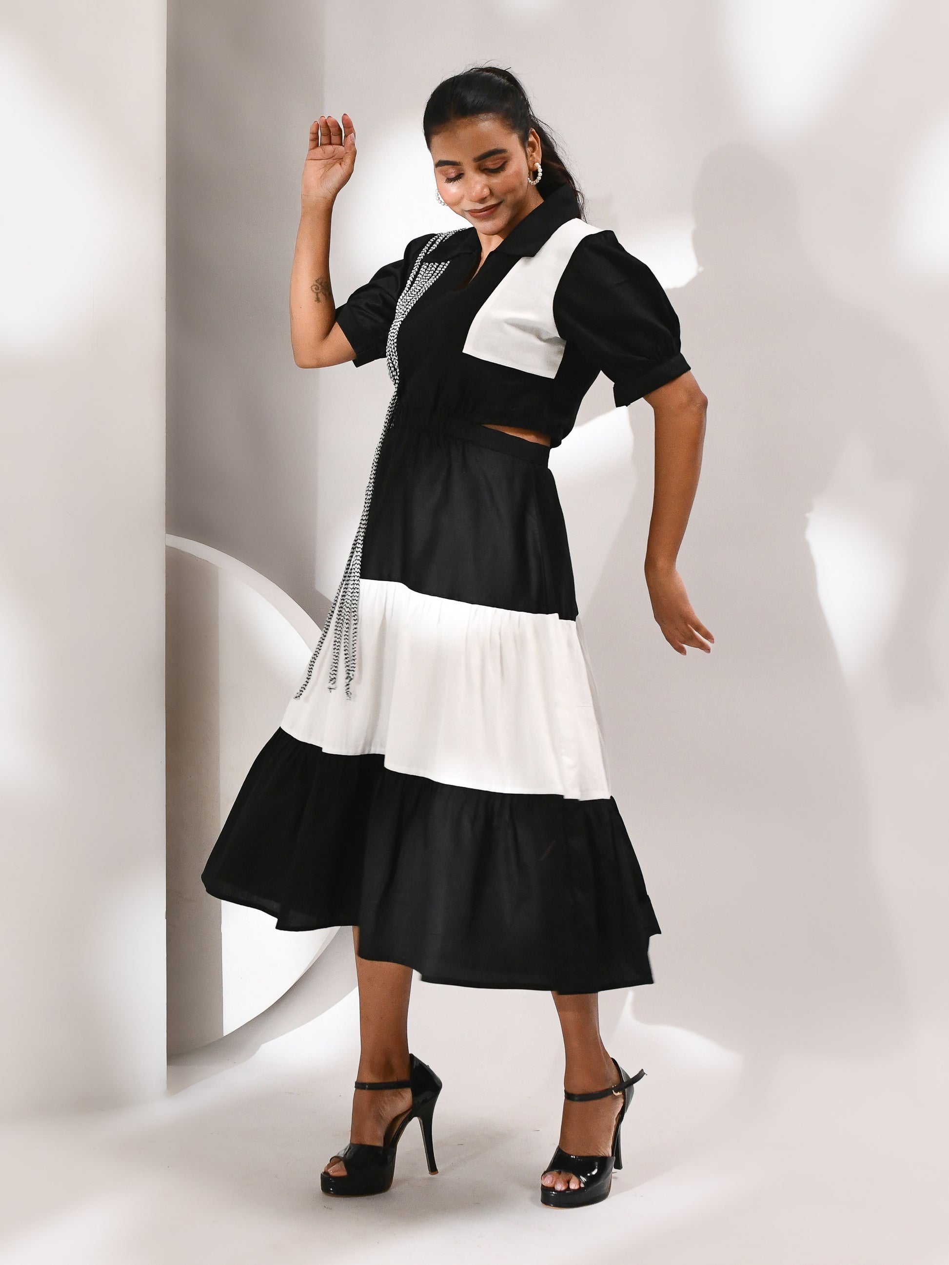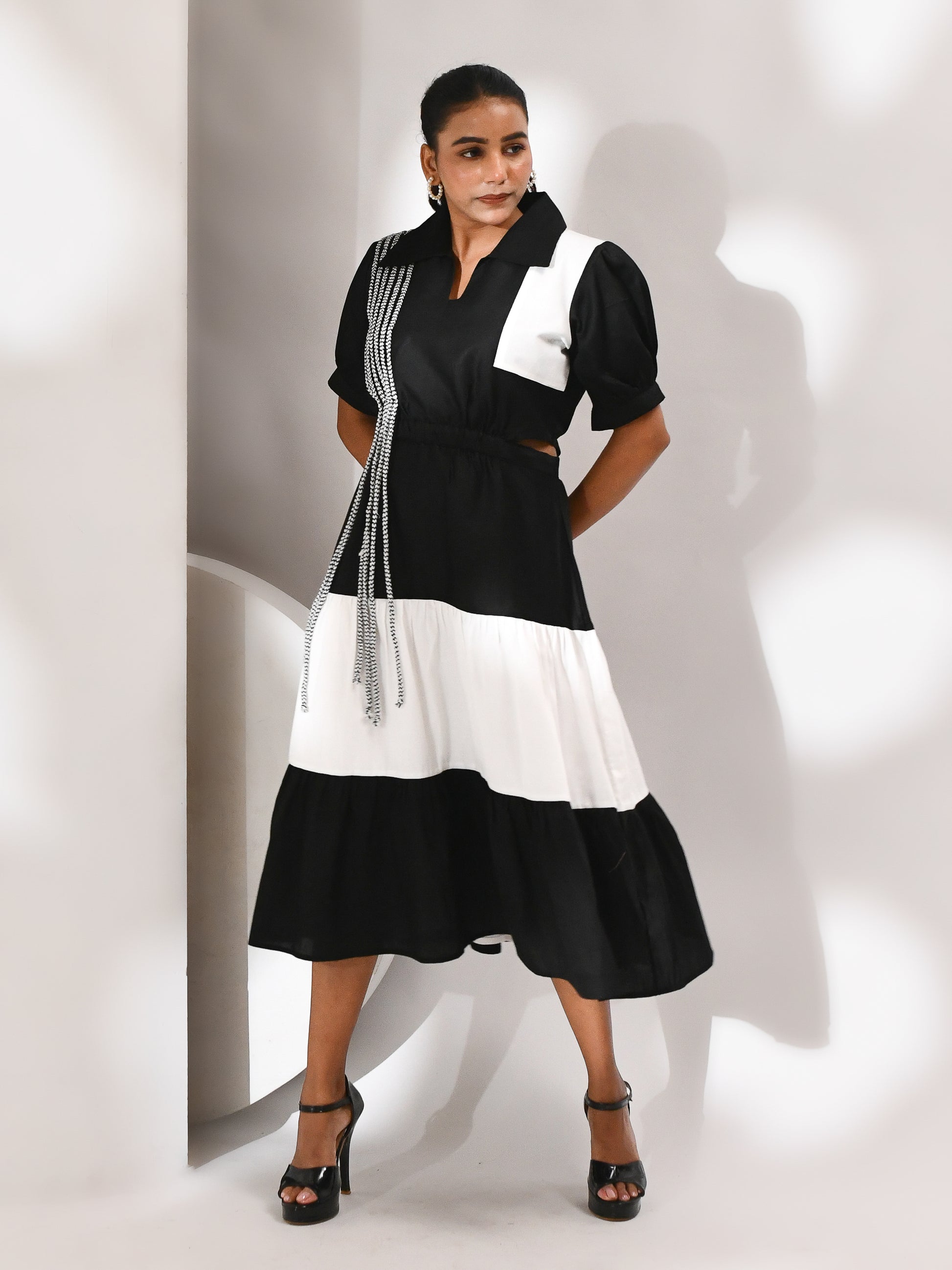 A monochrome masterpiece that plays with rhythm and rebellion, the Ink Cascade dress is tiered to perfection—each layer flowing with sculptural grace. Side cutouts add a bold contour, while the flared hemline brings kinetic energy to every step. Abstract dori detailing traces across the silhouette like a sketch in motion, adding texture and intrigue to its graphic palette.