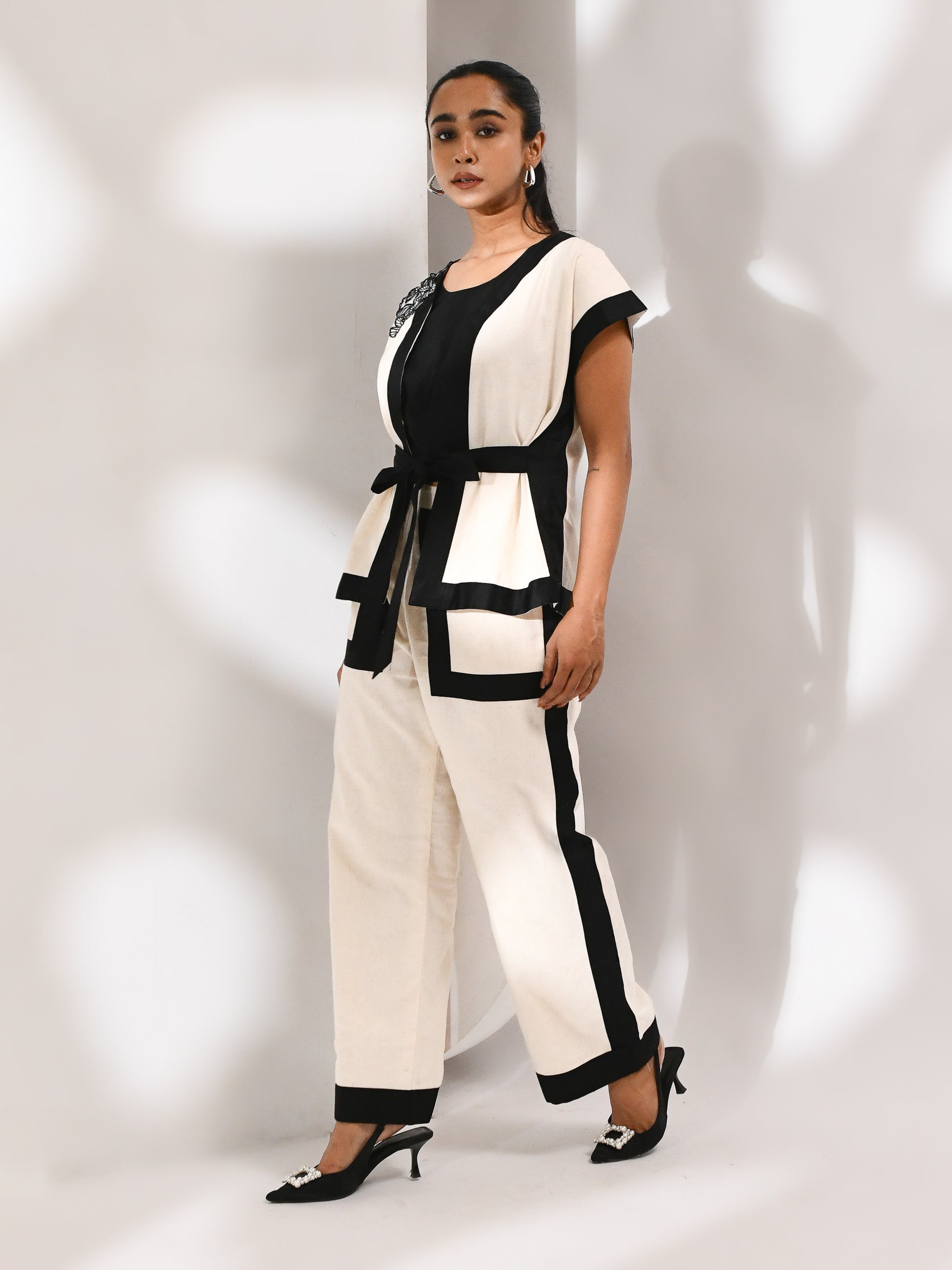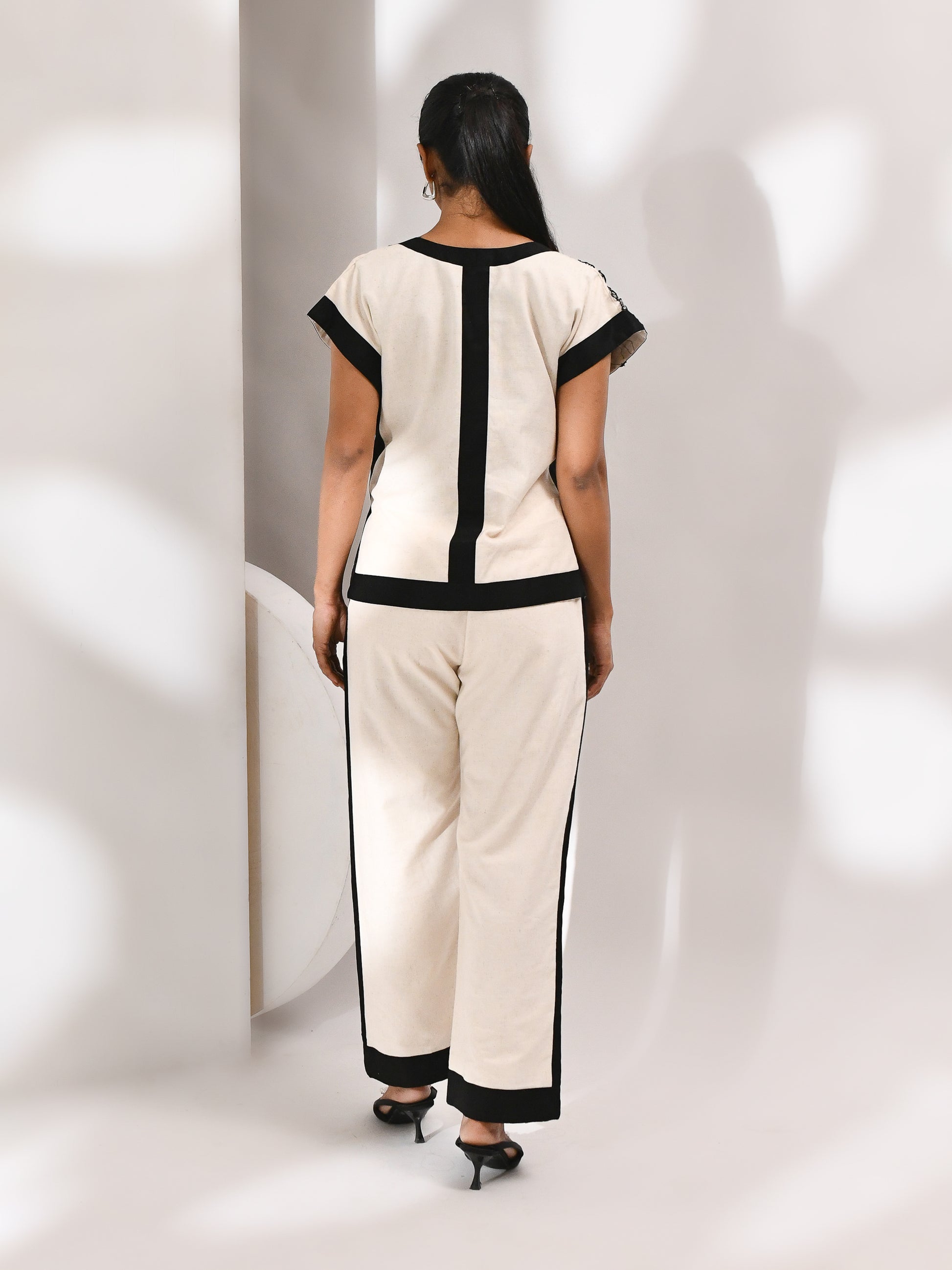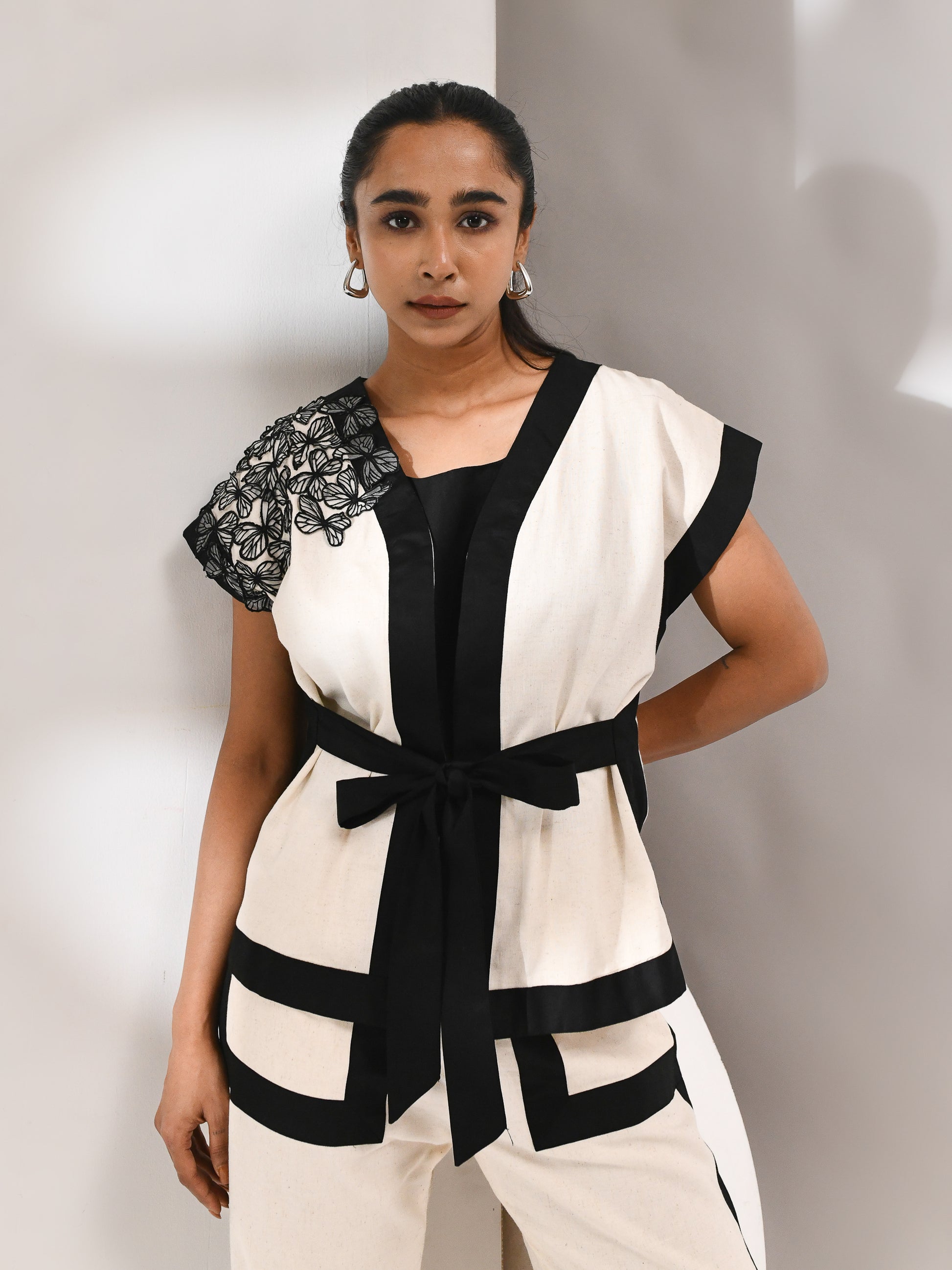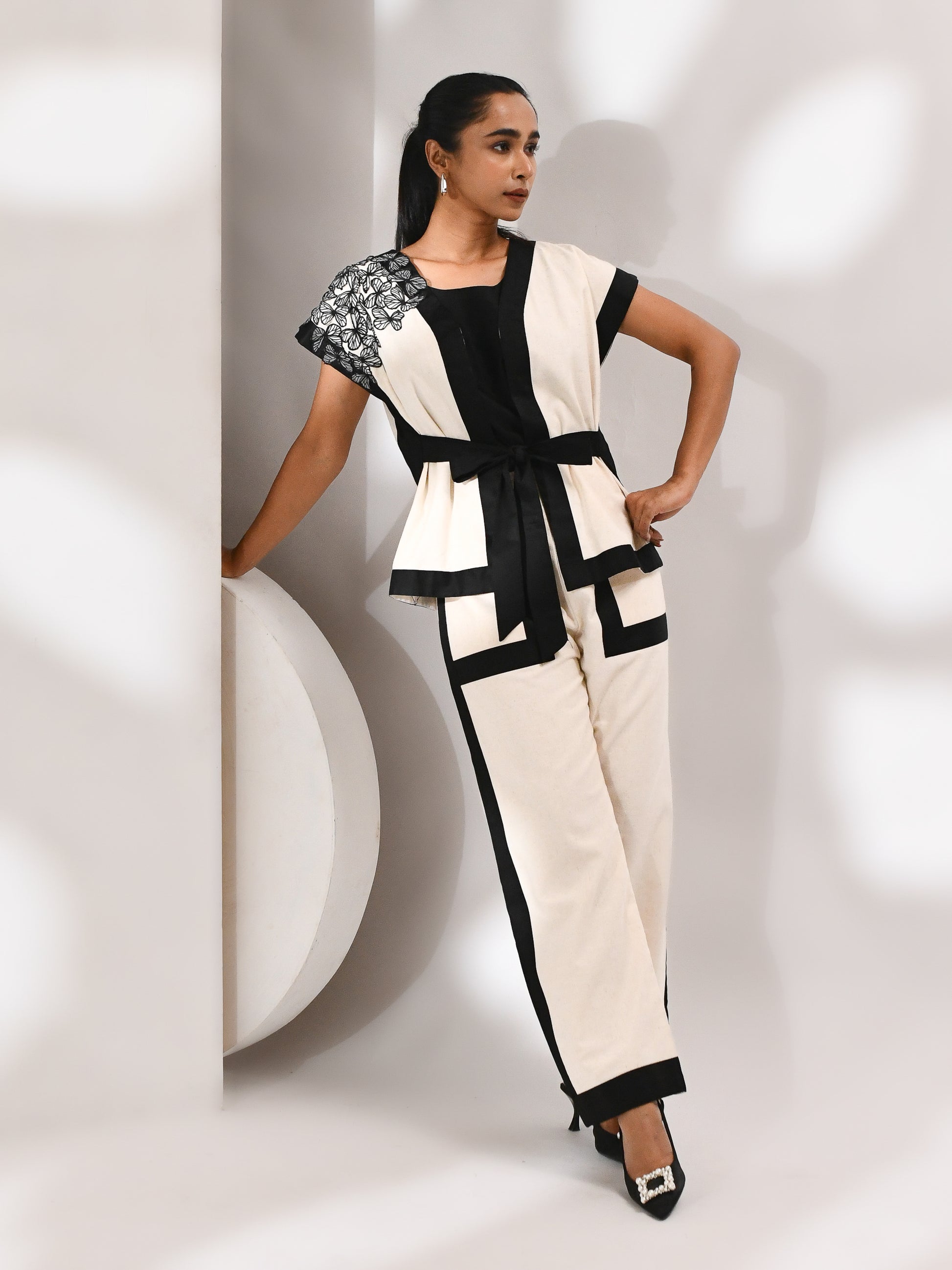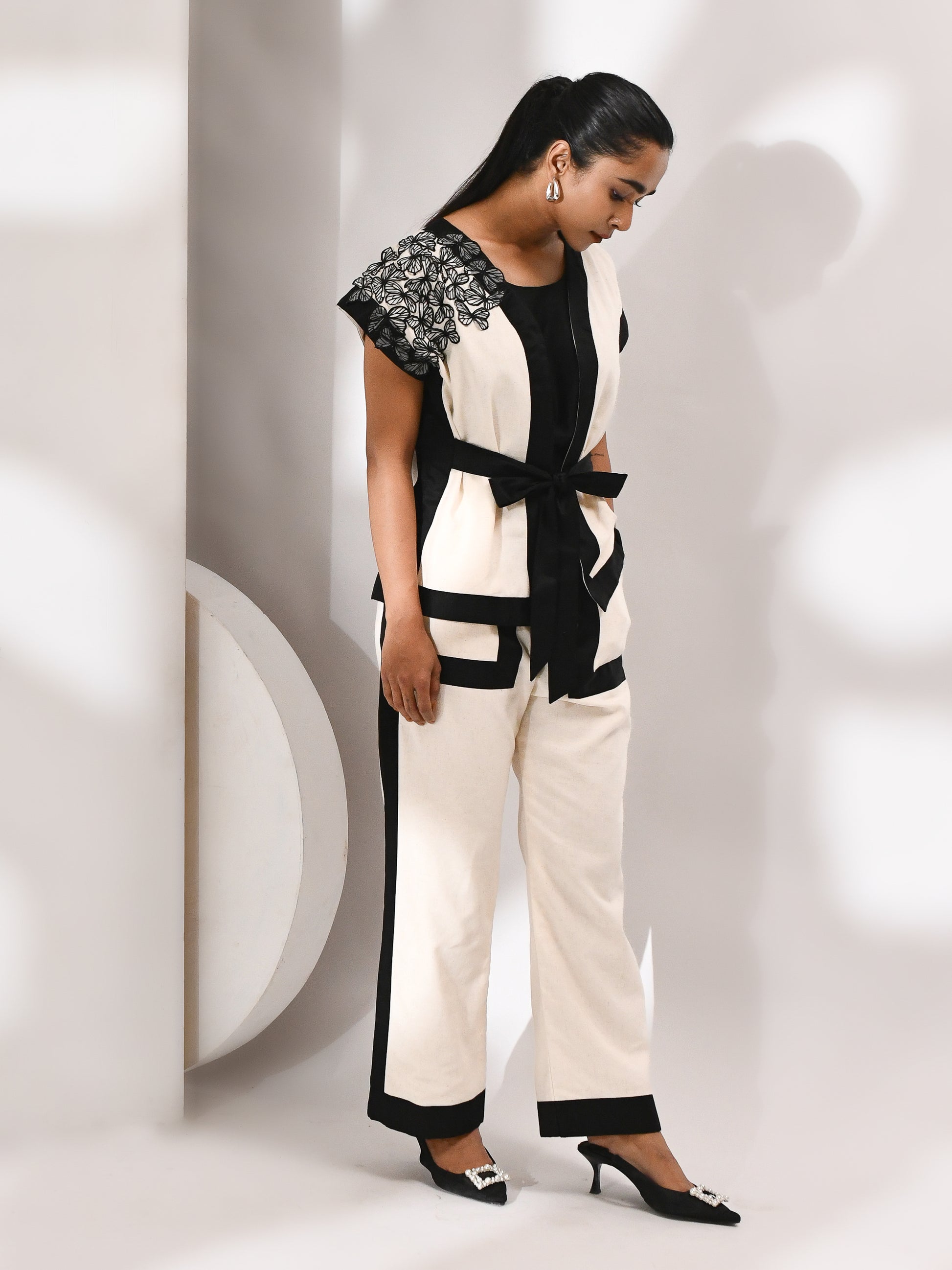 A composition of texture and intention. This coord set features a tailored silhouette softened by embroidery patch detailing—each motif a quiet accent, each stitch a deliberate pause. The top becomes a canvas of embedded artistry, where craftsmanship meets clarity. Inlay is not embellished—it’s composed, like a thought placed just so.
