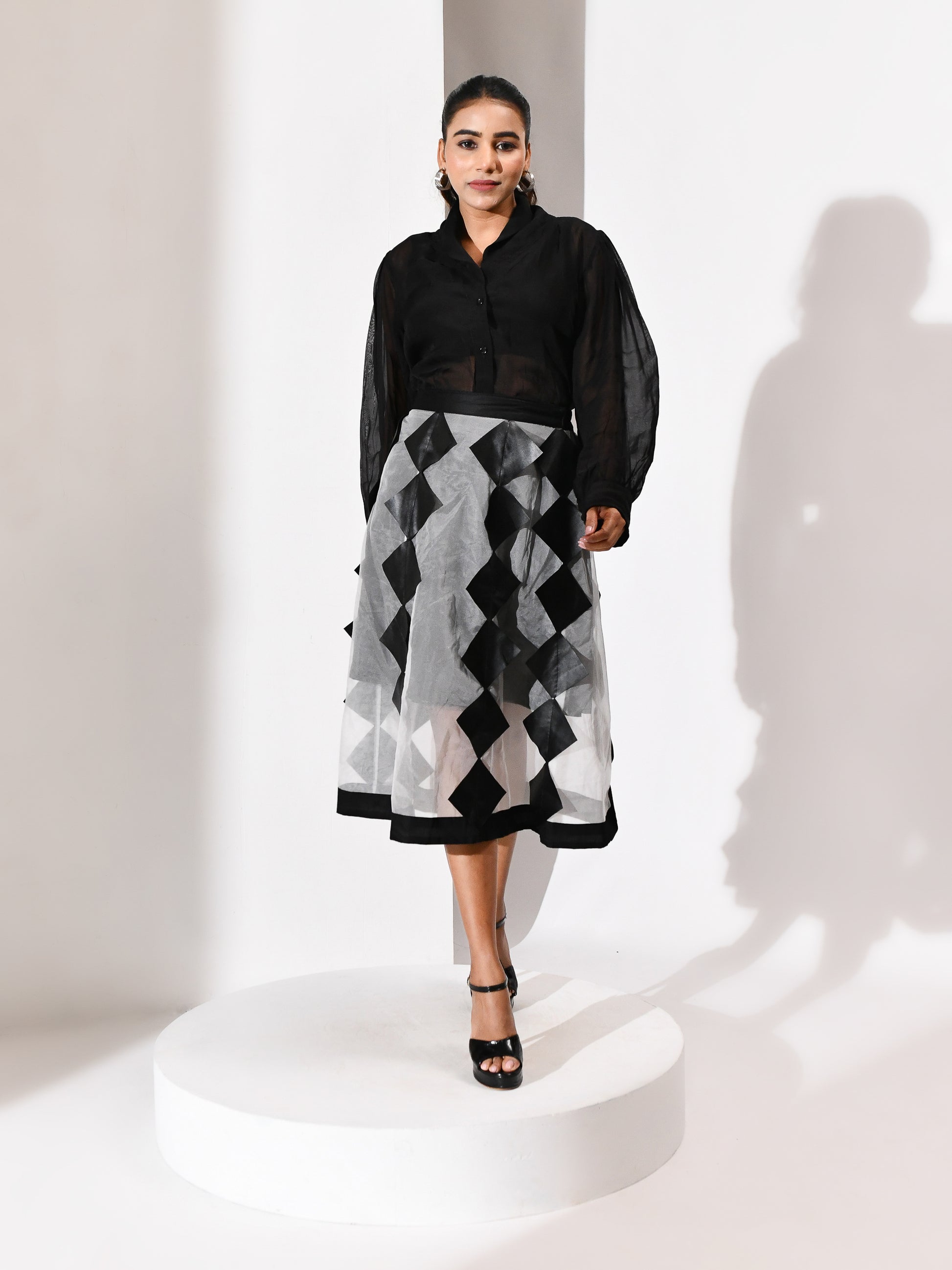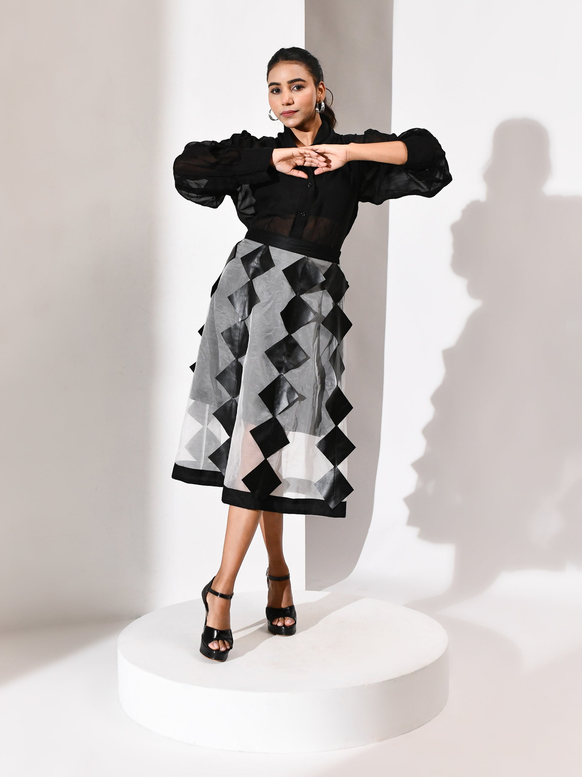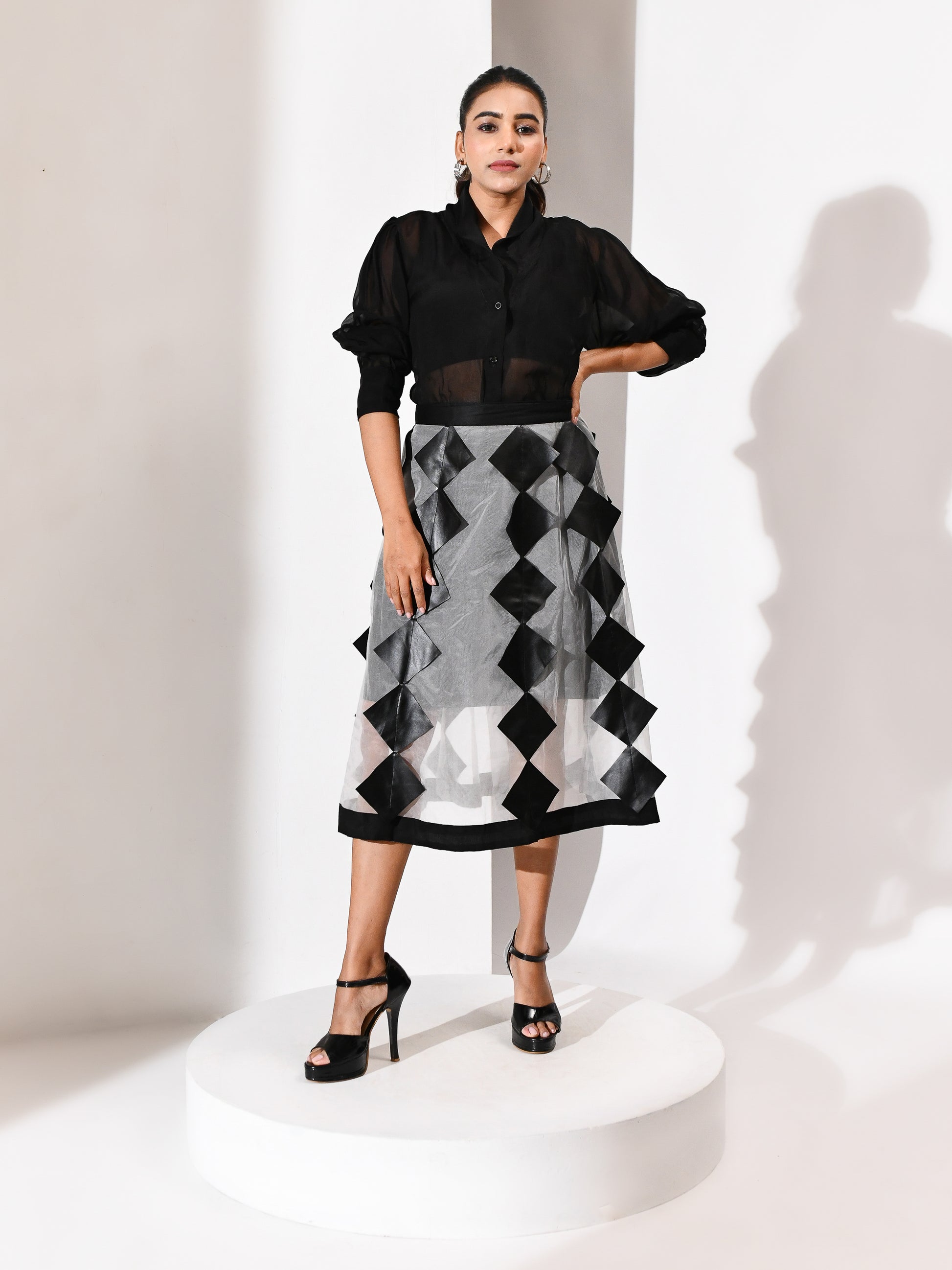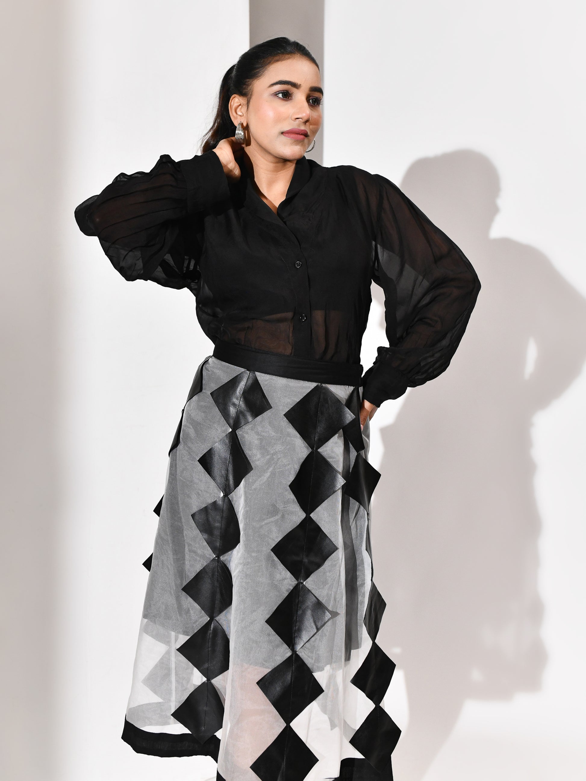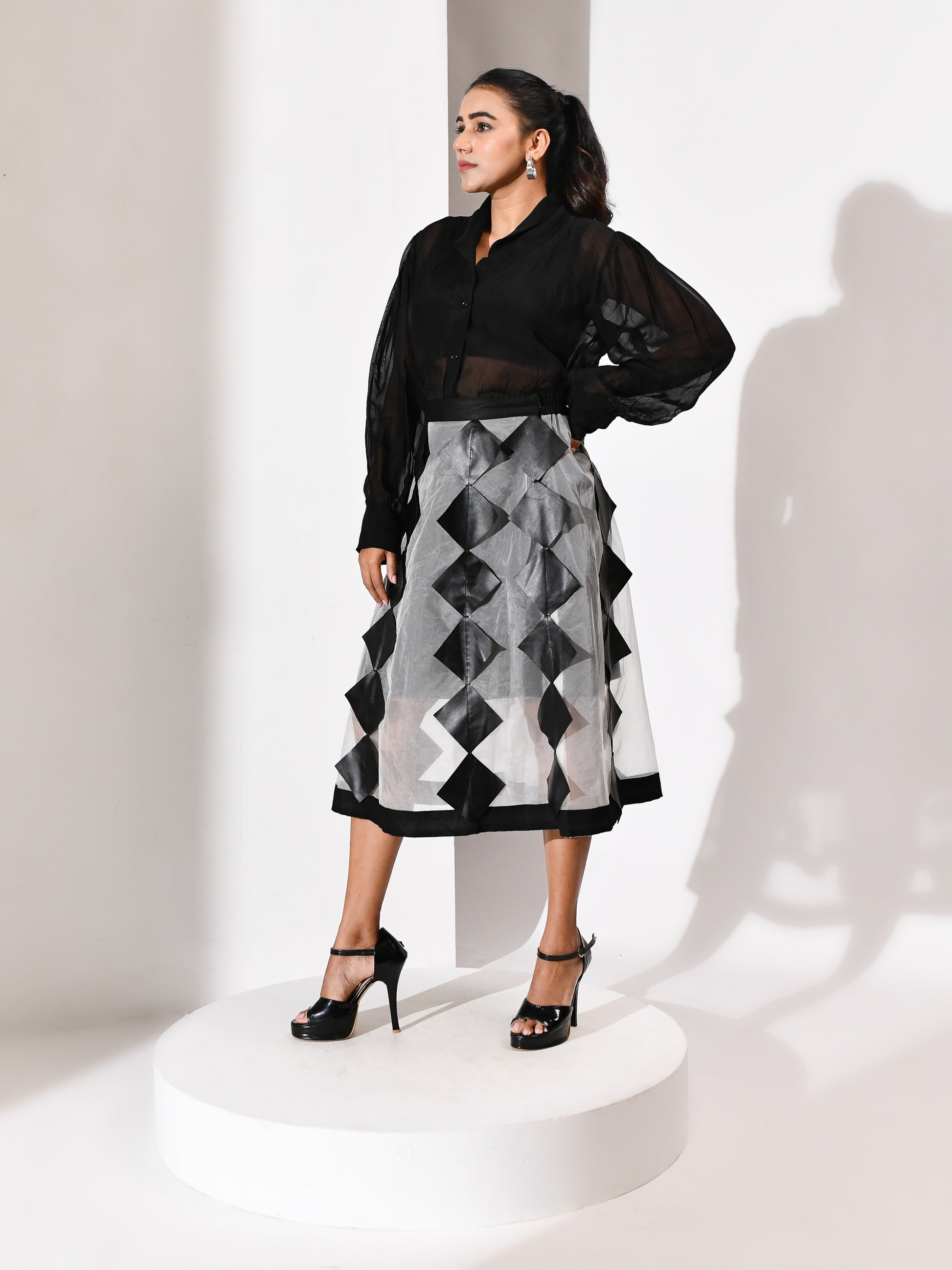 A bold interplay of texture and tone, this black-and-white skirt set pairs a sheer organza shirt with structured leather patchwork. Sleek, modern, and unapologetically refined—crafted for the woman who commands contrast with grace.This ensemble is designed for the woman who thrives in contrast: delicate yet defined, graceful yet grounded. Whether styled for a gallery evening or a power lunch, it speaks of modern elegance with a rebellious undertone.