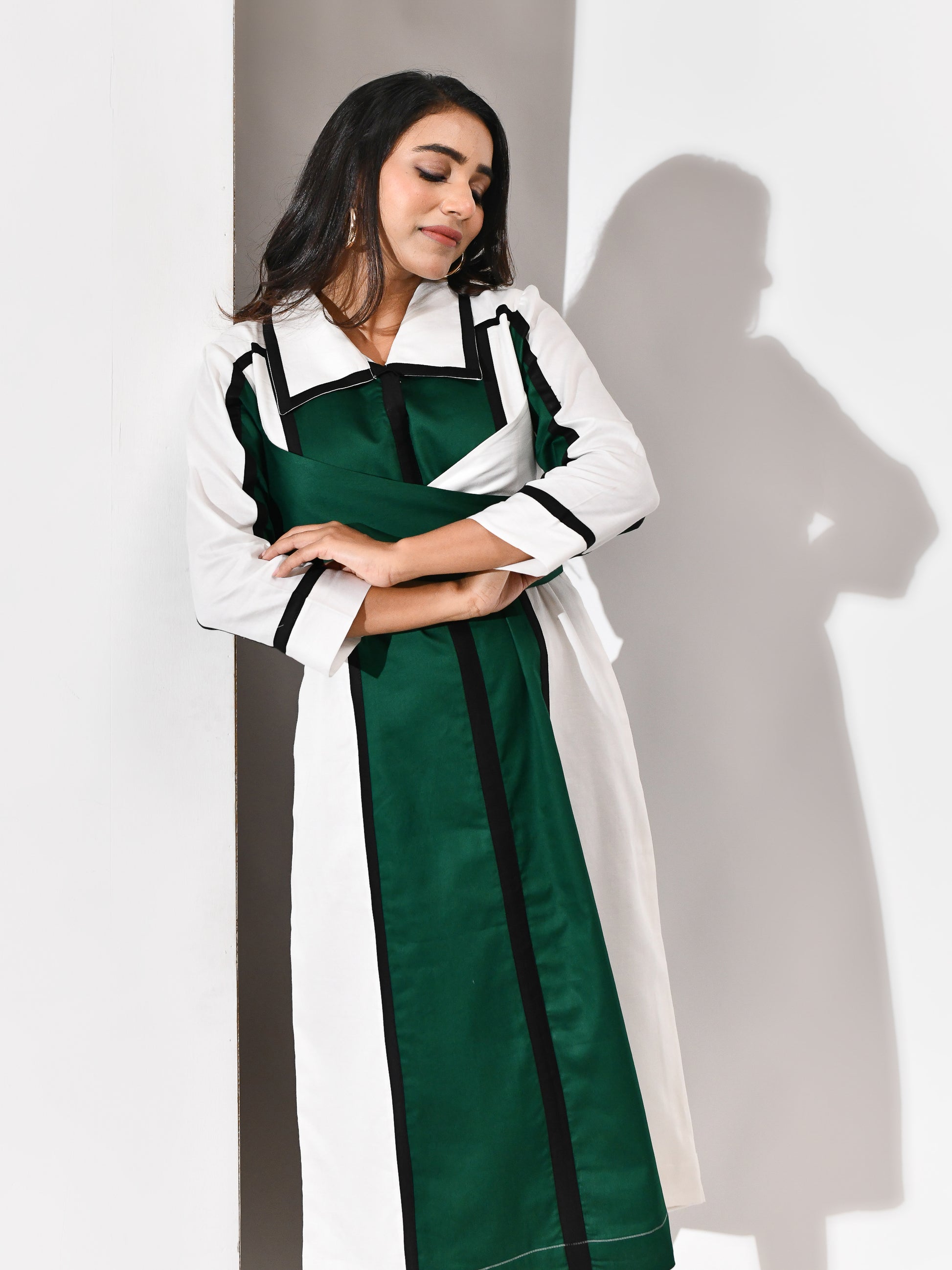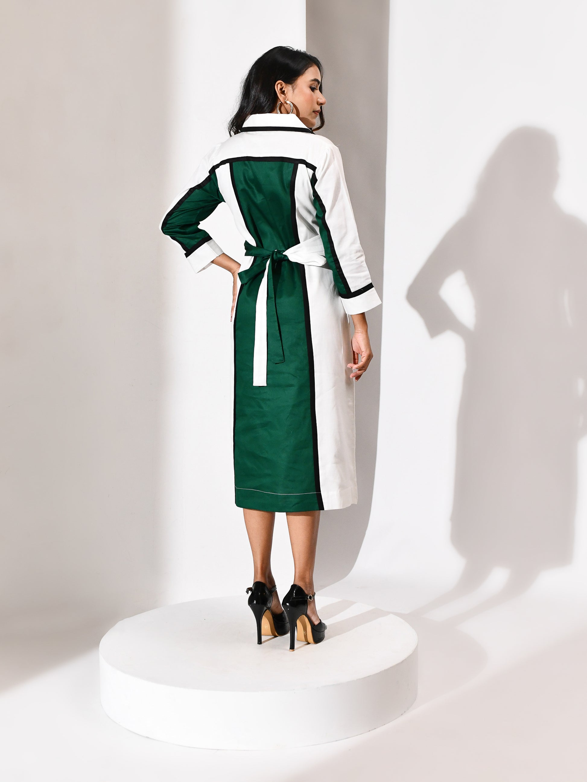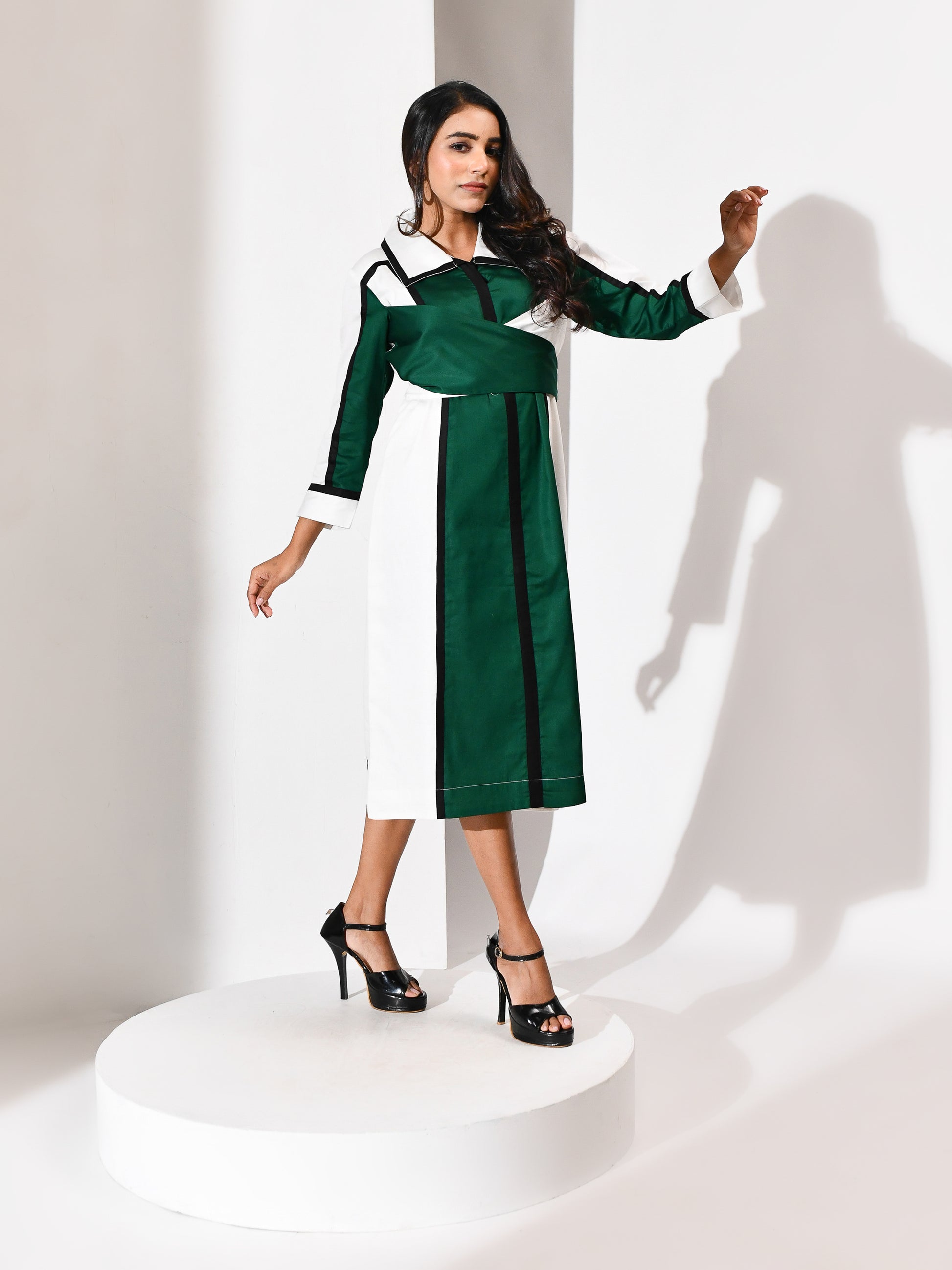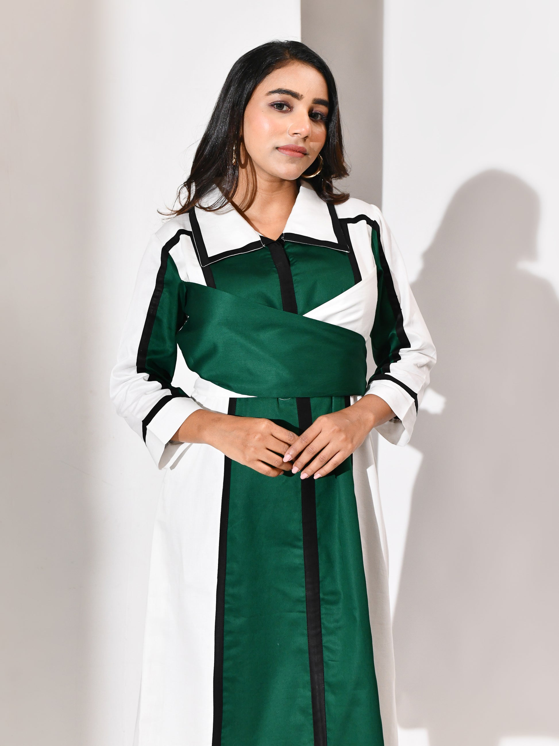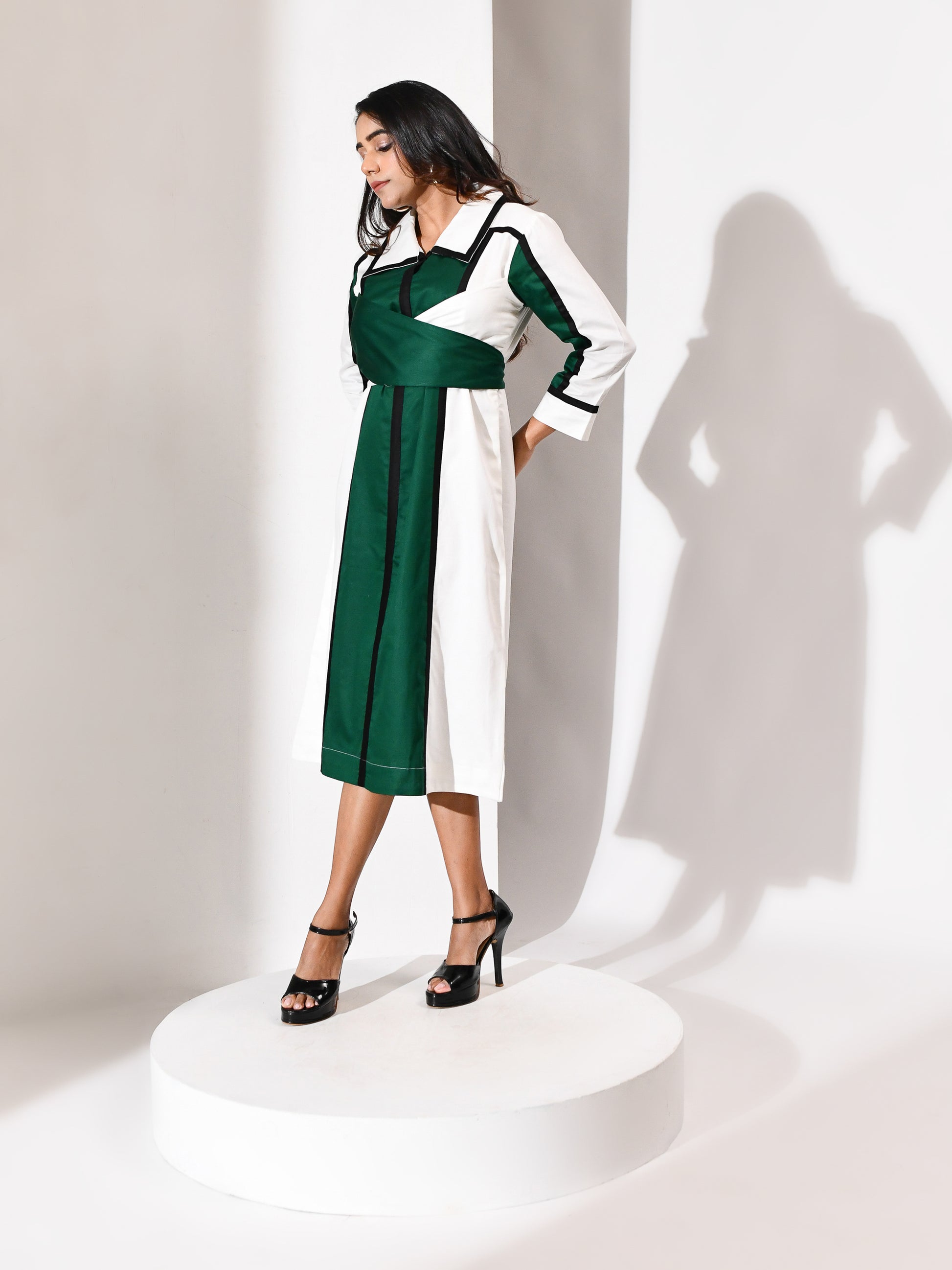 A silhouette sculpted in motion. This wrap dress weaves together crisp white, verdant green, and bold black in a symphony of contrast. The lines are deliberate, the drape intuitive—designed to flatter, empower, and move with grace. Tailored for the woman who commands attention without raising her voice, it’s a portrait of modern elegance wrapped in quiet strength.